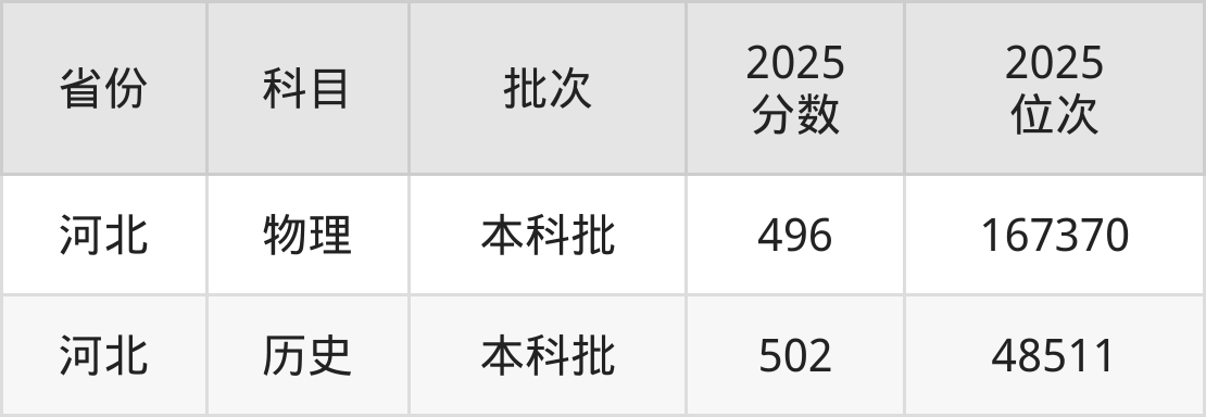 最低录取分数线是496分,对应位次是167370名,招生地区为河北。