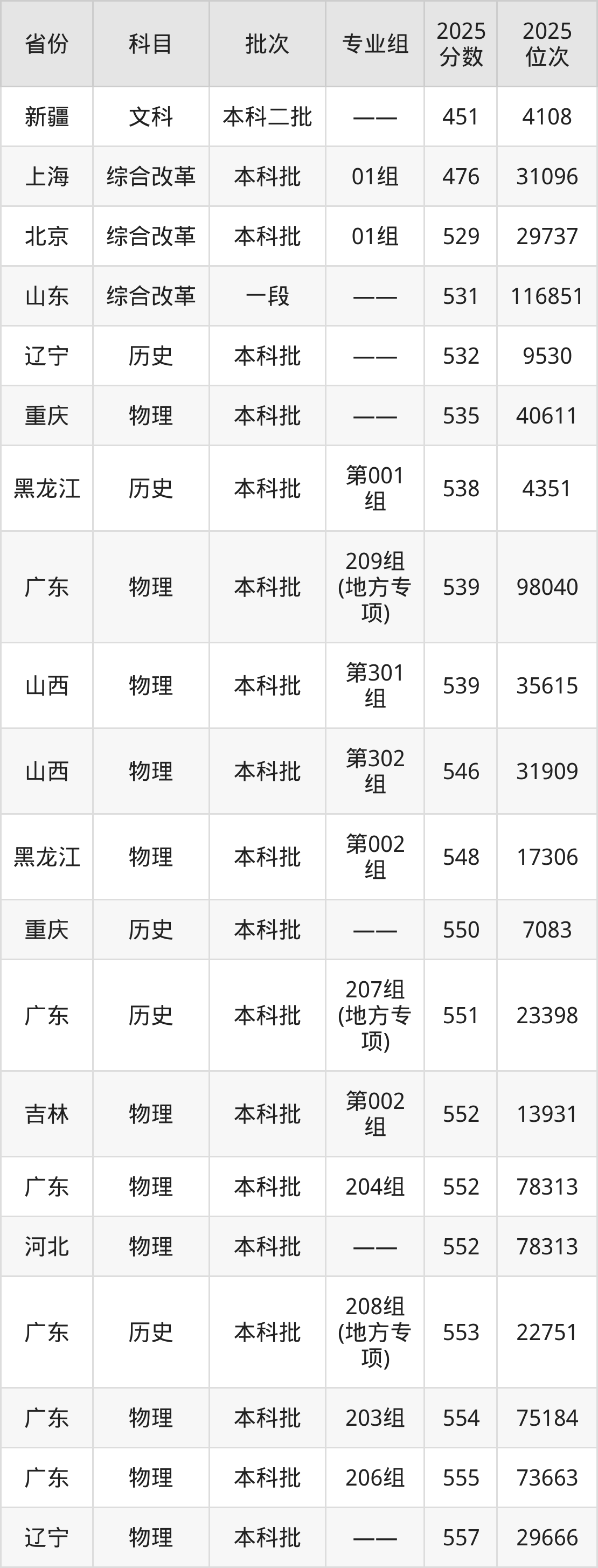 最低录取分数线是451分,对应位次是4108名,招生地区为新疆;