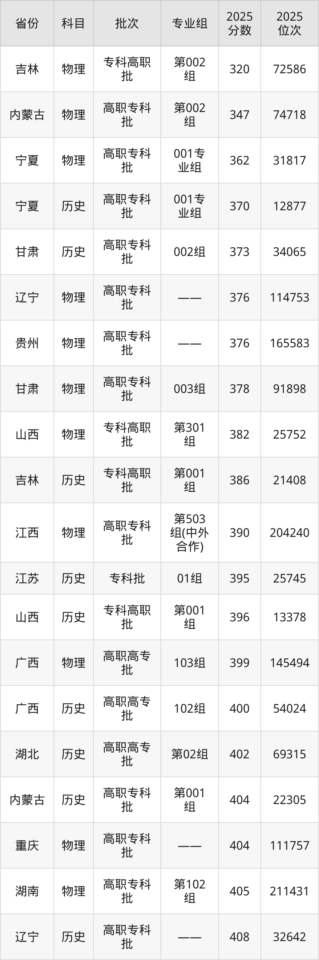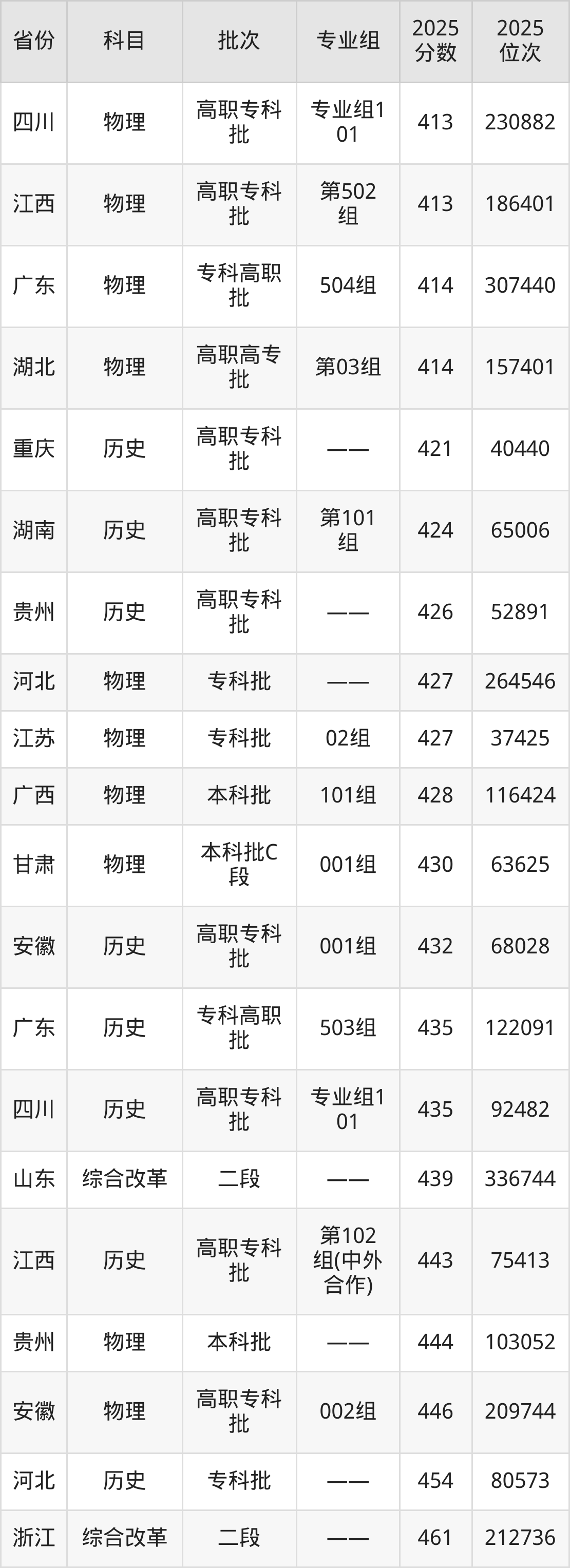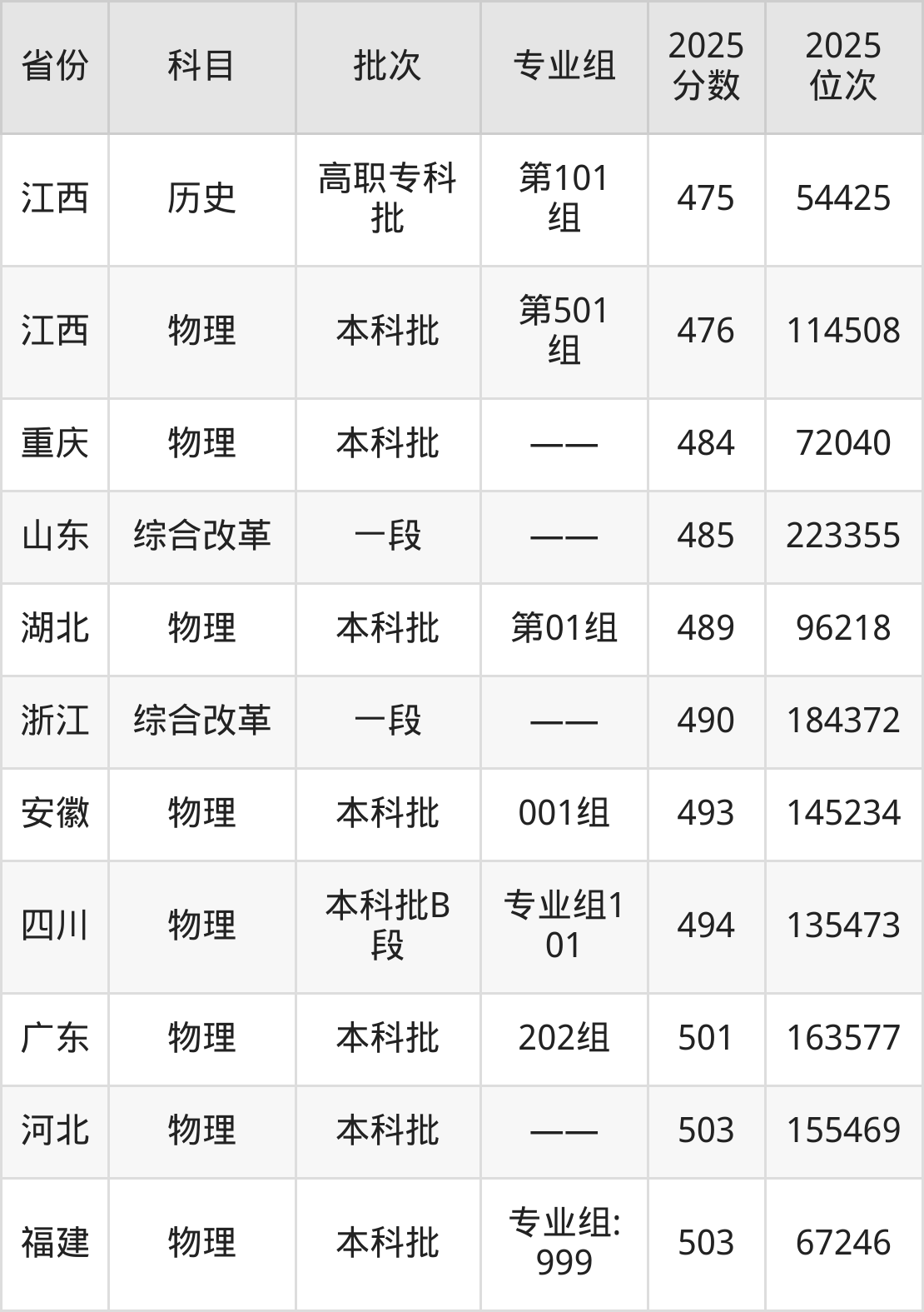 2025年江西职业技术大学在各省普通批录取分数线一览表: