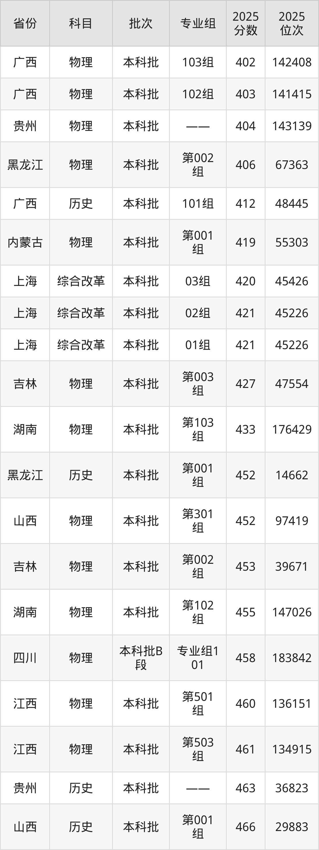 最低录取分数线是402分,对应位次是142408名,招生地区为广西;