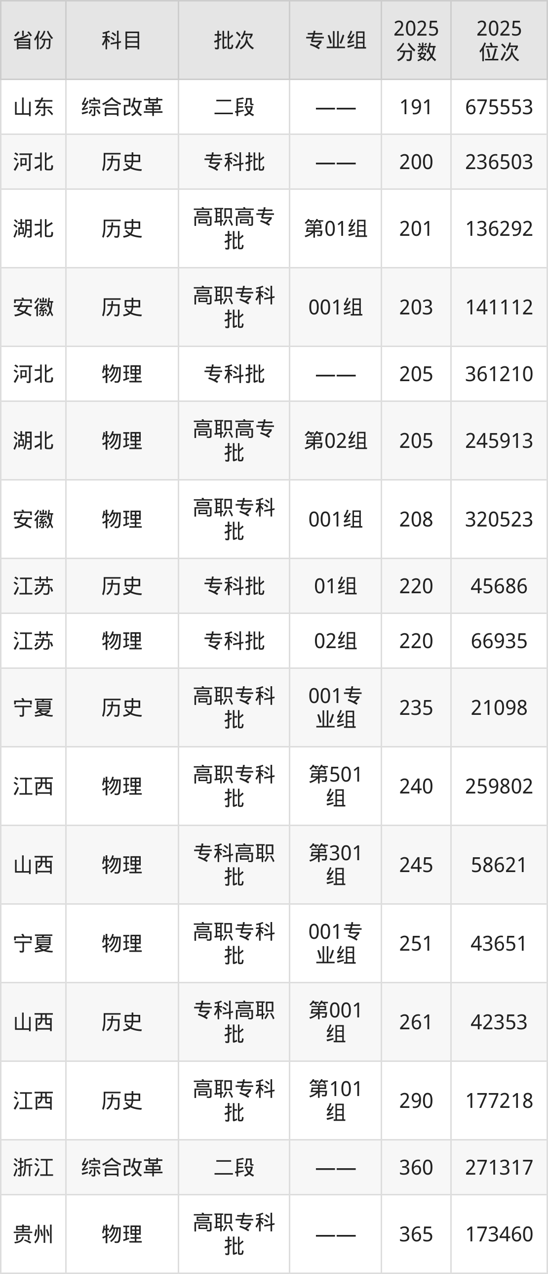 2025年金山职业技术学院在各省普通批录取分数线一览表: