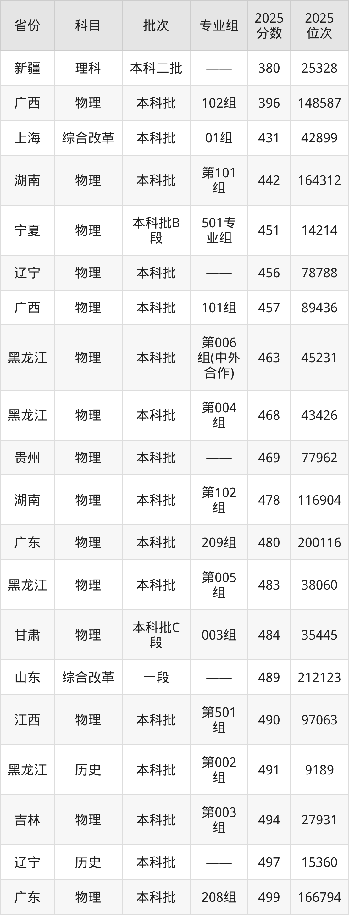 最低录取分数线是380分,对应位次是25328名,招生地区为新疆;