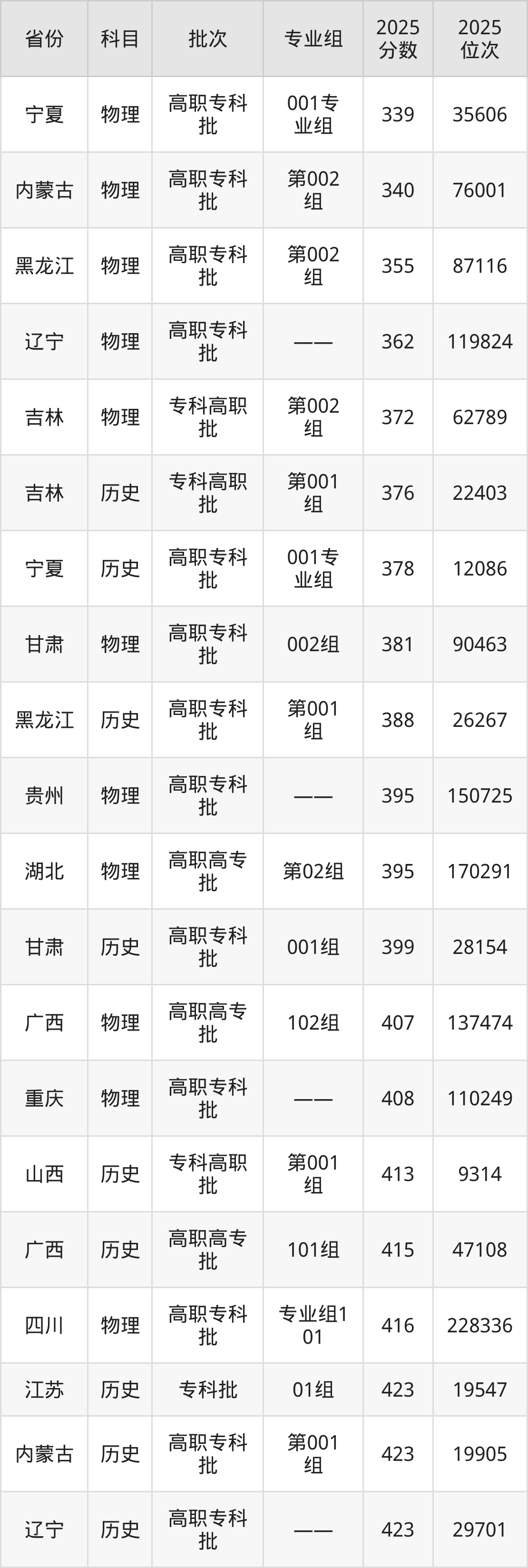 2025年湖南大众传媒职业技术学院在各省普通批录取分数线一览表: