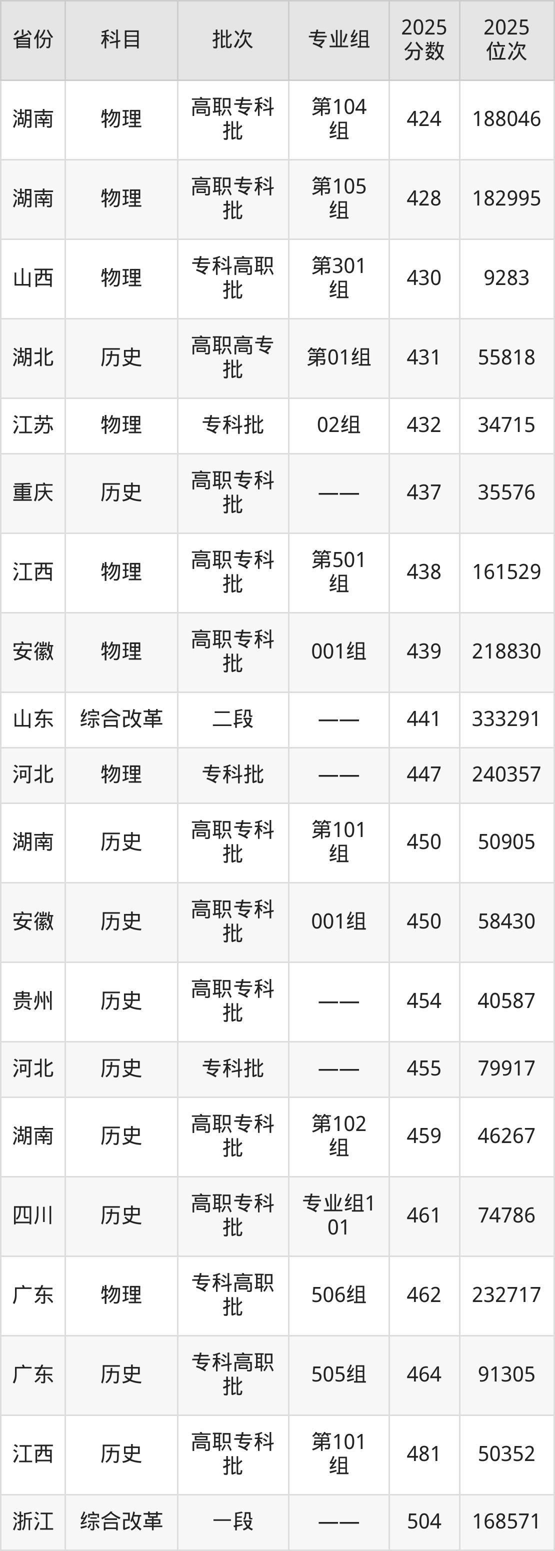2025年湖南大众传媒职业技术学院在各省物理类的录取分数线位于339分-462分之间。