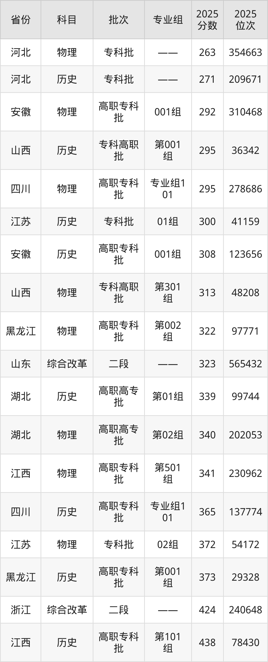 最低录取分数线是263分,对应位次是354663名,招生地区为河北;