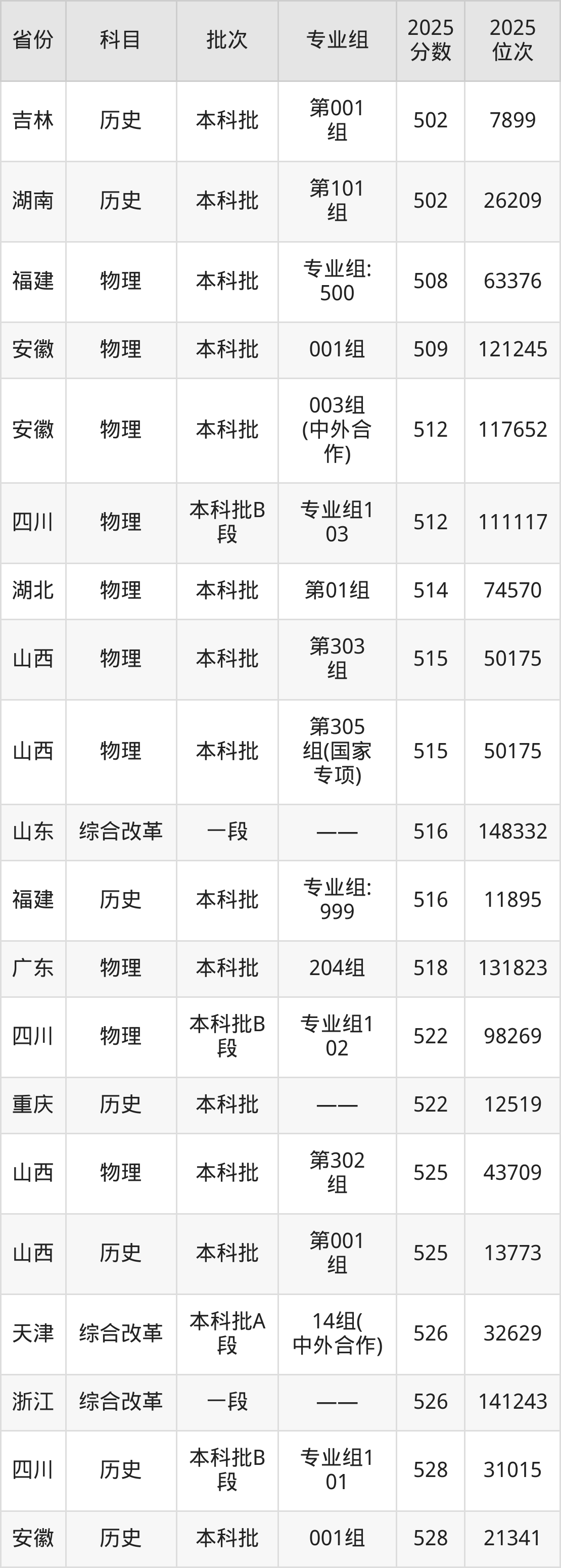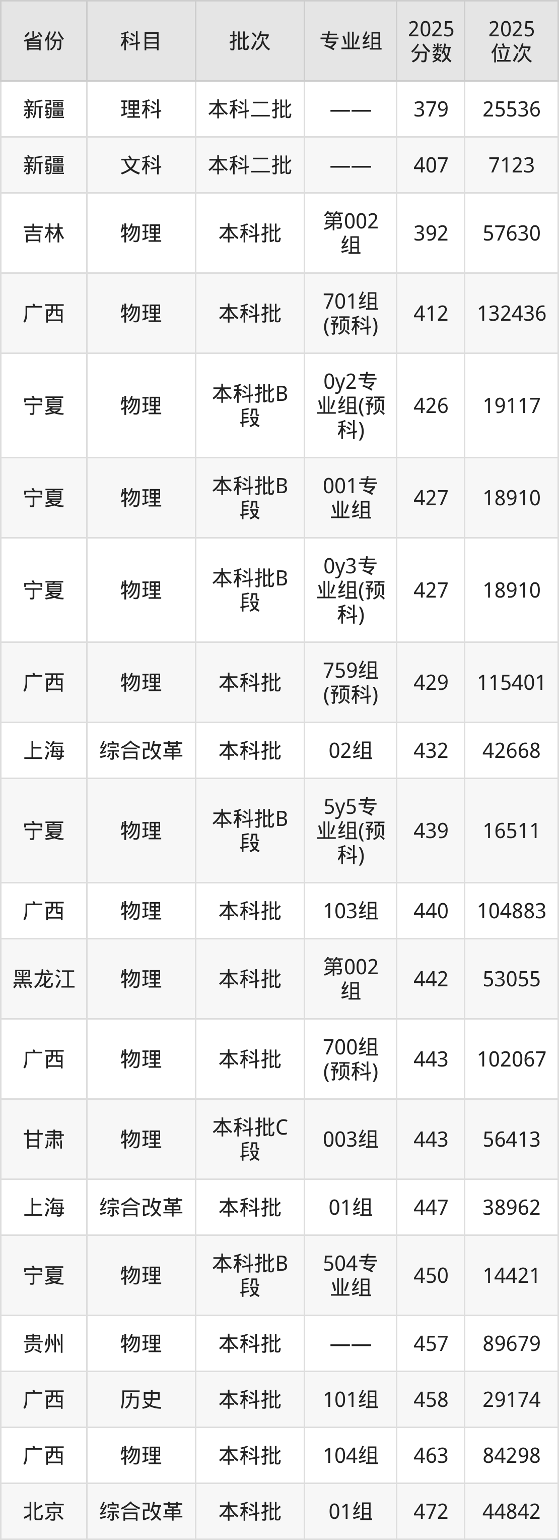 最低录取分数线是379分,对应位次是25536名,招生地区为新疆;