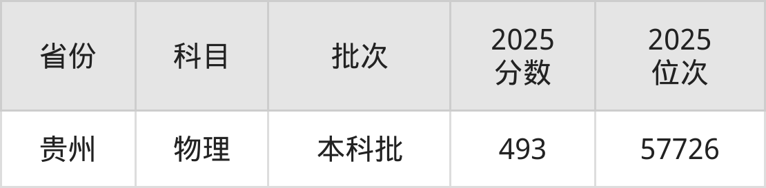 最低录取分数线是493分,对应位次是57726名,招生地区为贵州。