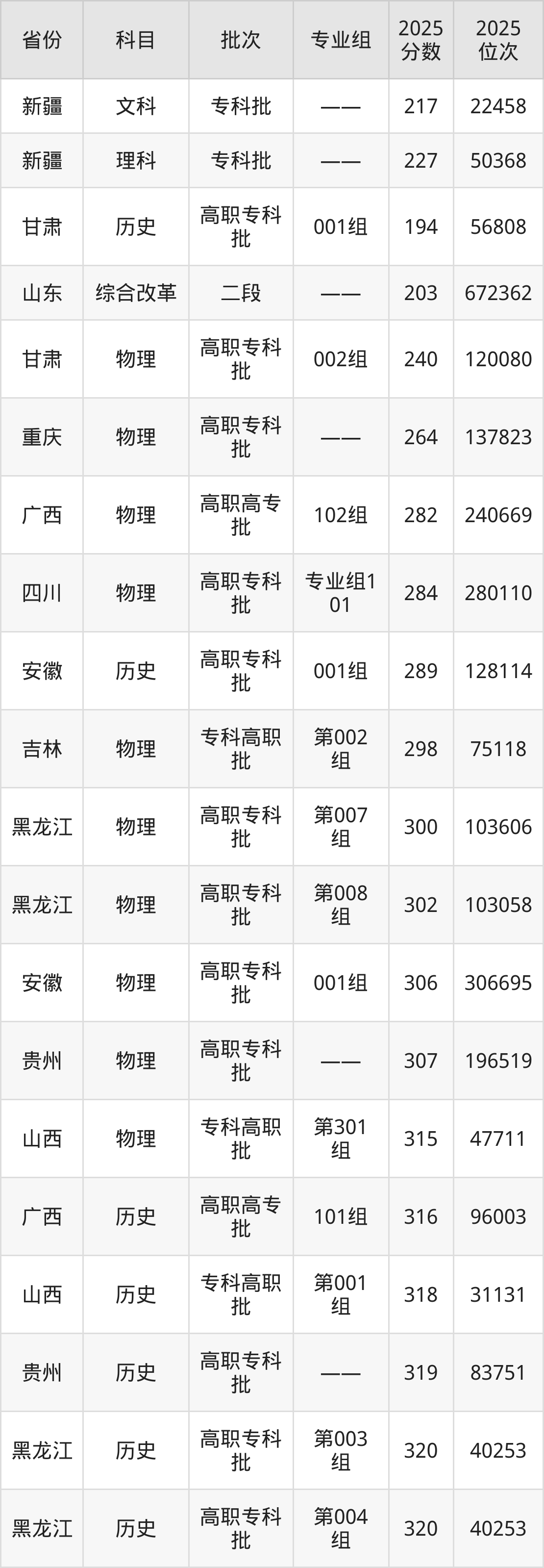 2025年黑龙江农垦职业学院在各省普通批录取分数线一览表: