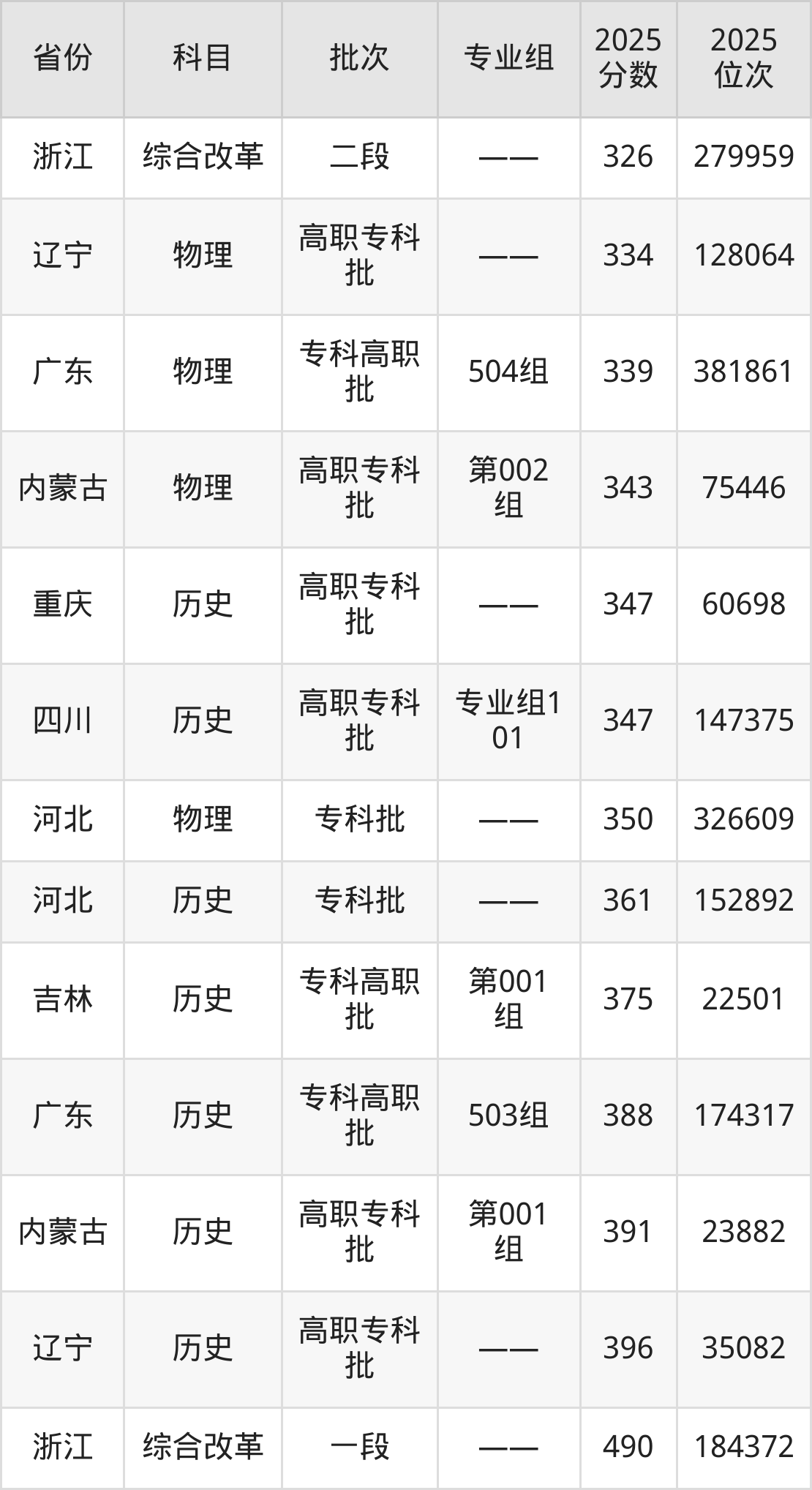 最高录取分数线是350分,对应位次是326609名,招生地区为河北。