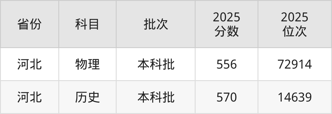 最低录取分数线是556分,对应位次是72914名,招生地区为河北。