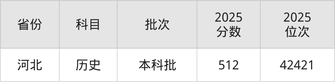 最低录取分数线是512分,对应位次是42421名,招生地区为河北。