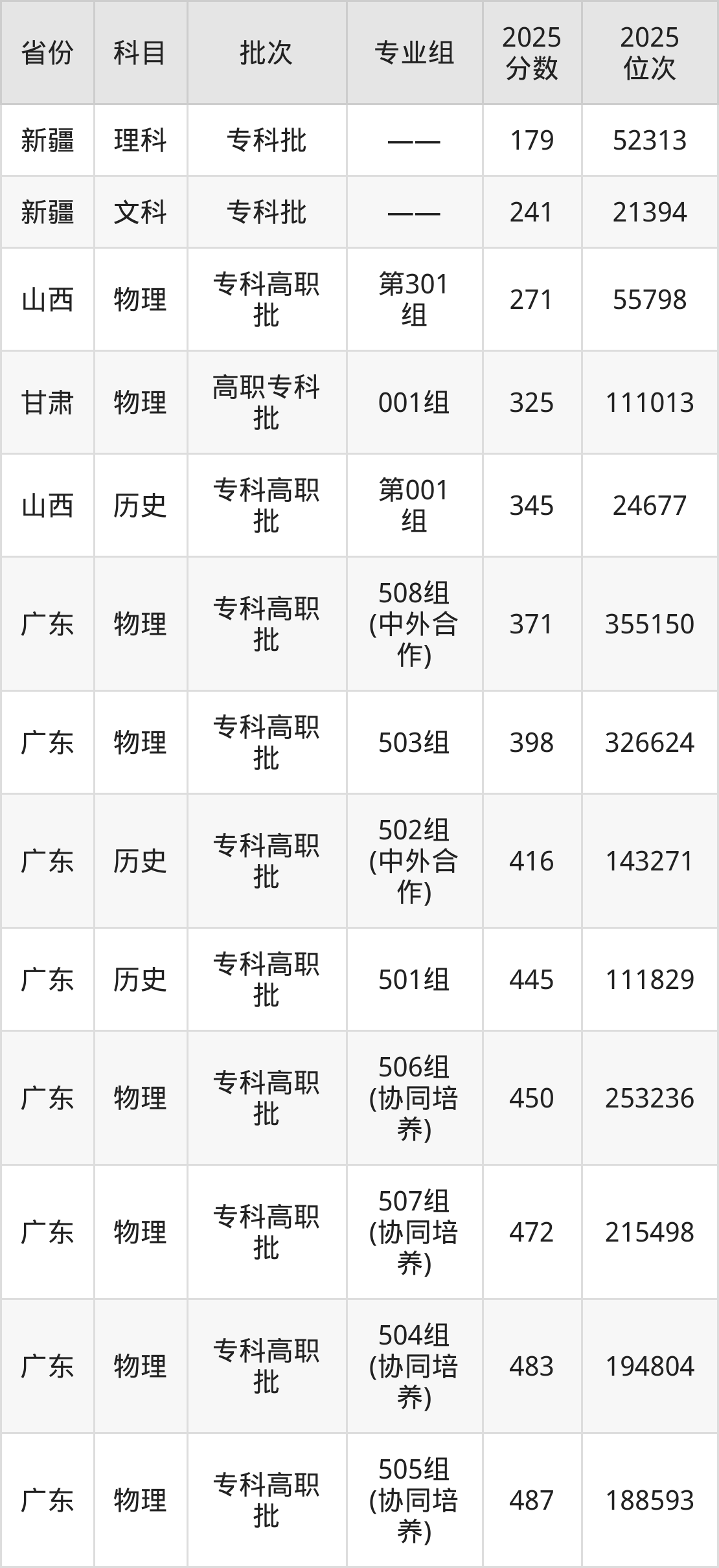 2025年广东职业技术学院在各省普通批录取分数线一览表: