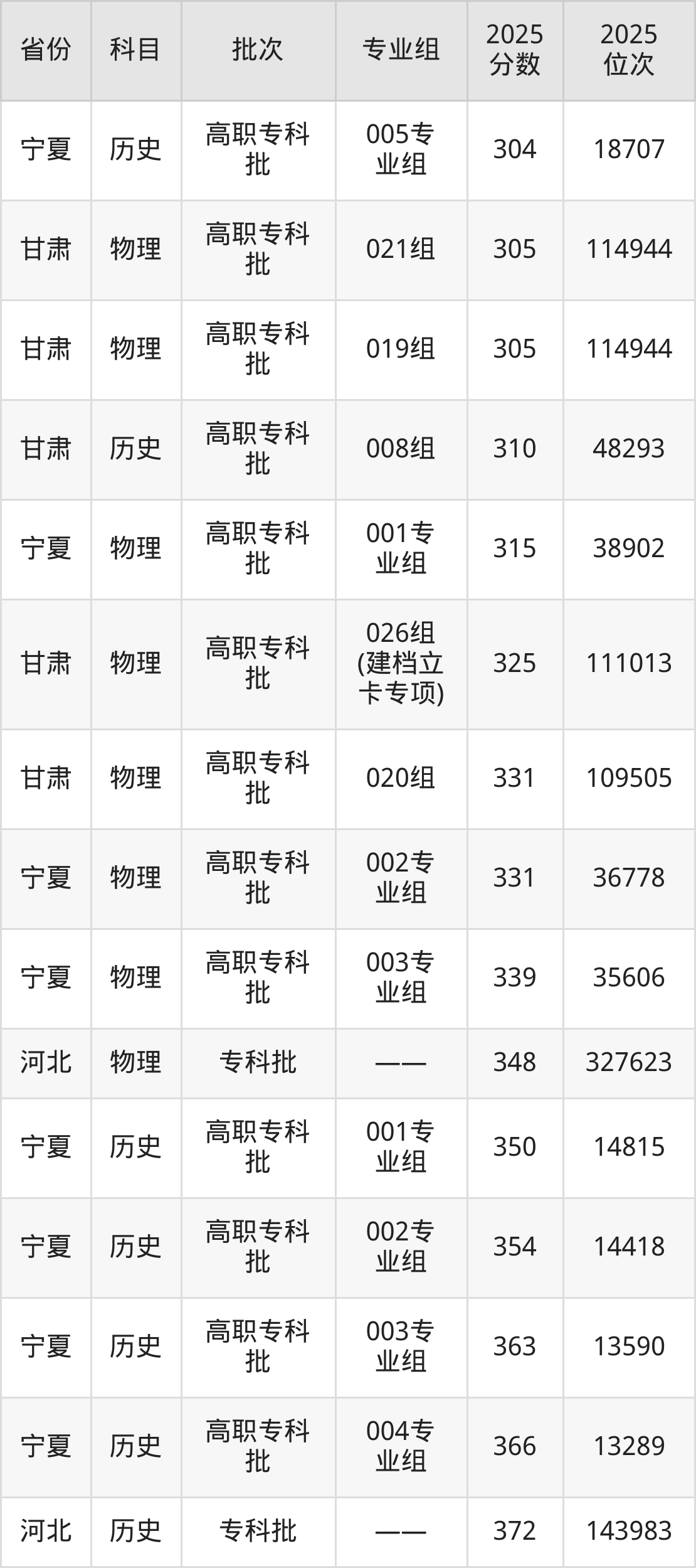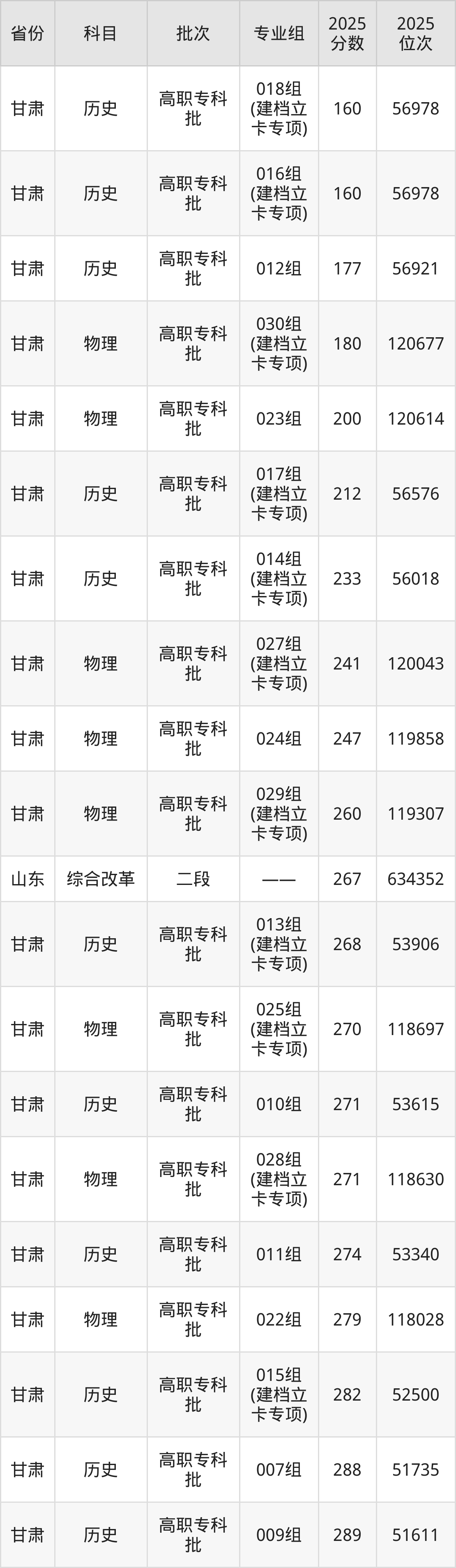 2025年庆阳职业技术学院在各省普通批录取分数线一览表:
