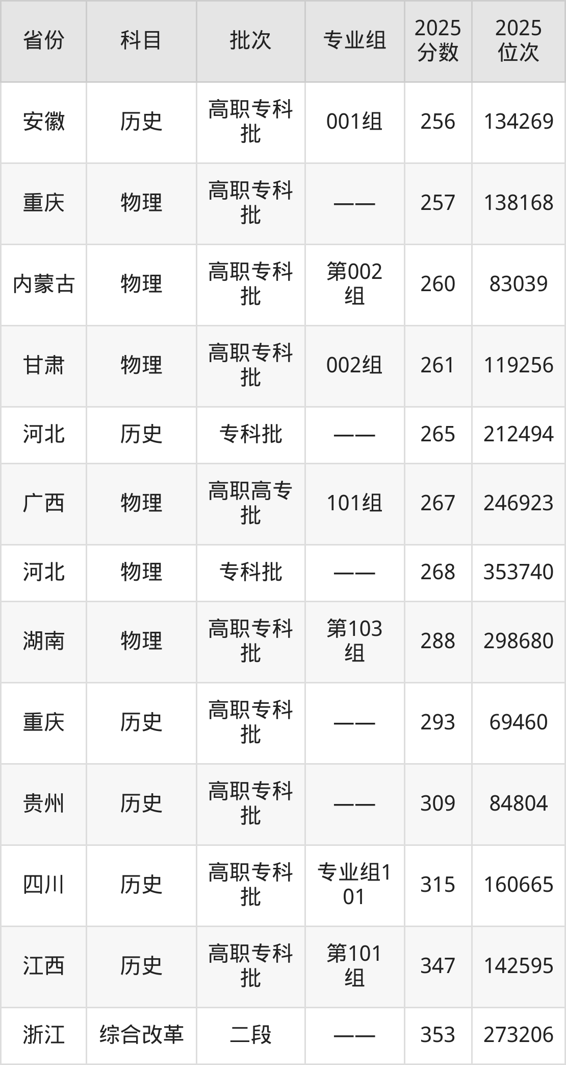 2025年重庆信息技术职业学院在各省普通批录取分数线一览表: