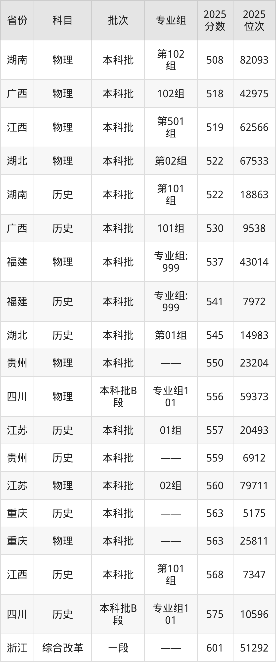 最低录取分数线是508分,对应位次是82093名,招生地区为湖南;