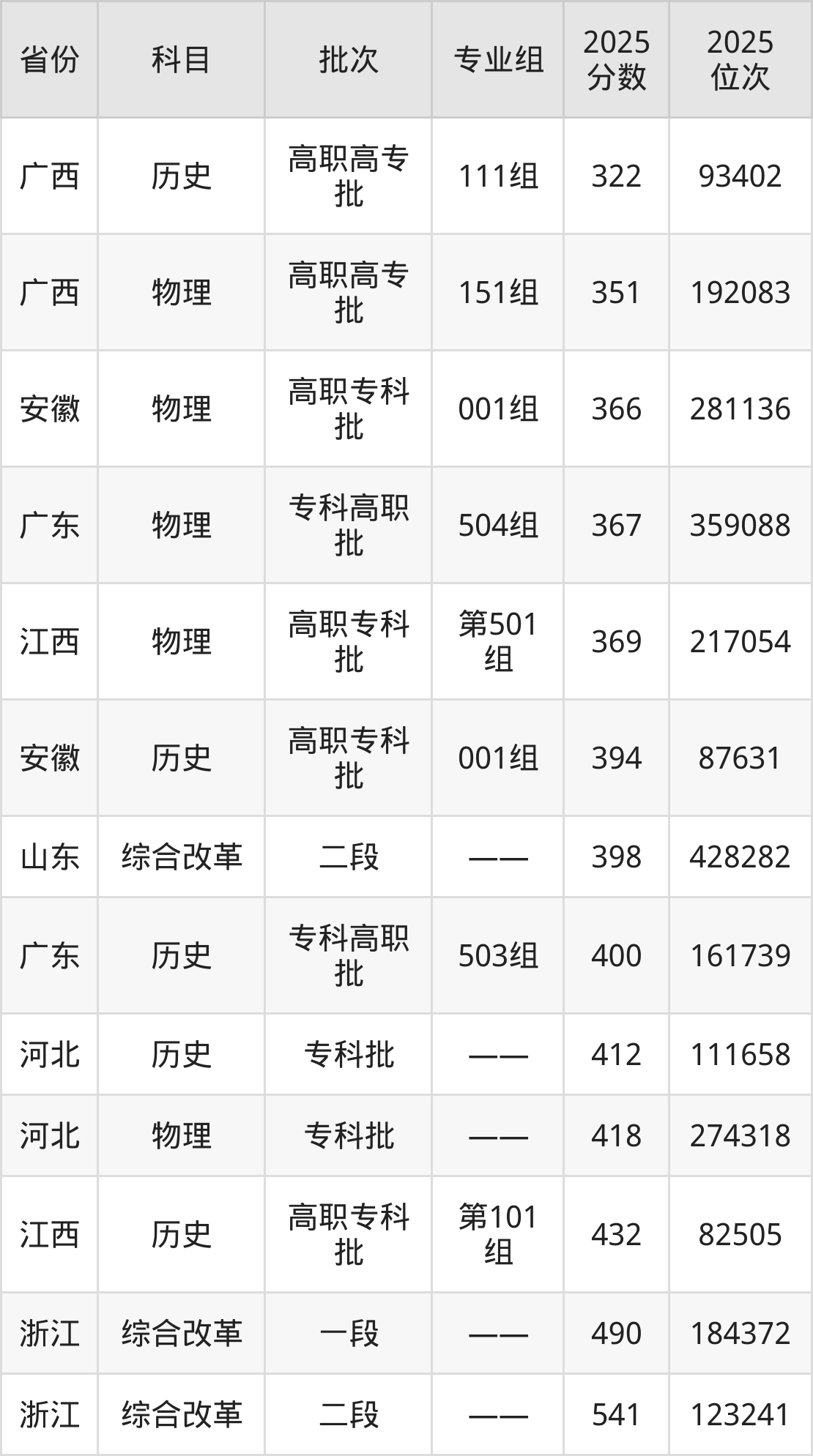 最高录取分数线是541分,对应位次是123241名,招生地区为浙江。