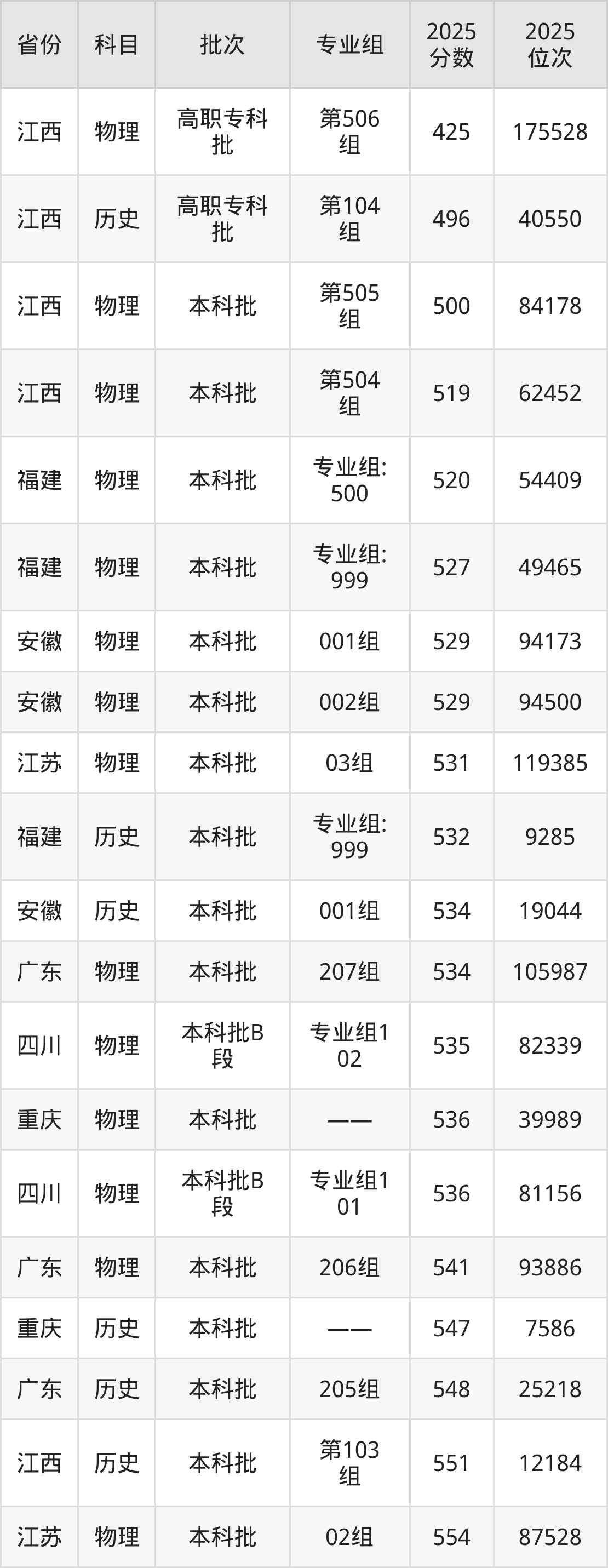 最低录取分数线是425分,对应位次是175528名,招生地区为江西;
