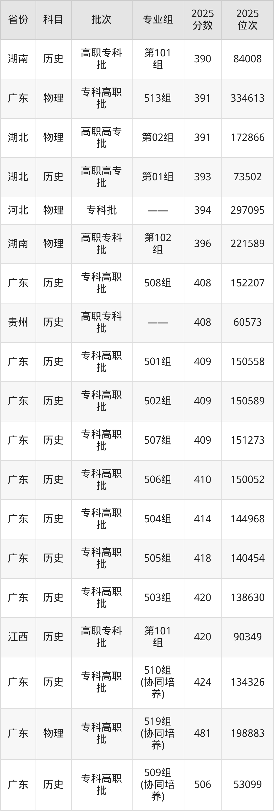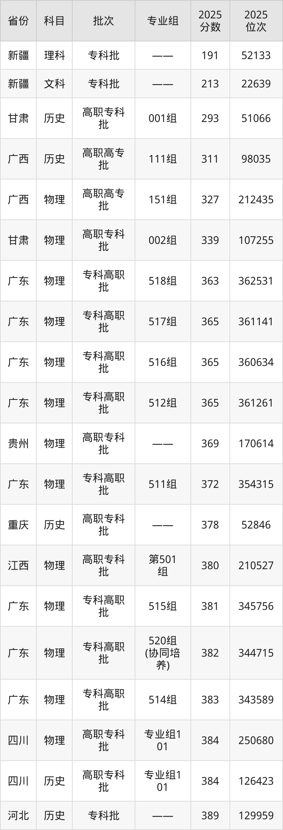 2025年茂名职业技术学院在各省普通批录取分数线一览表: