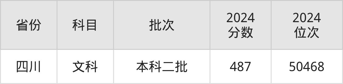 最低录取分数线是487分,对应位次是50468名,招生地区为四川。