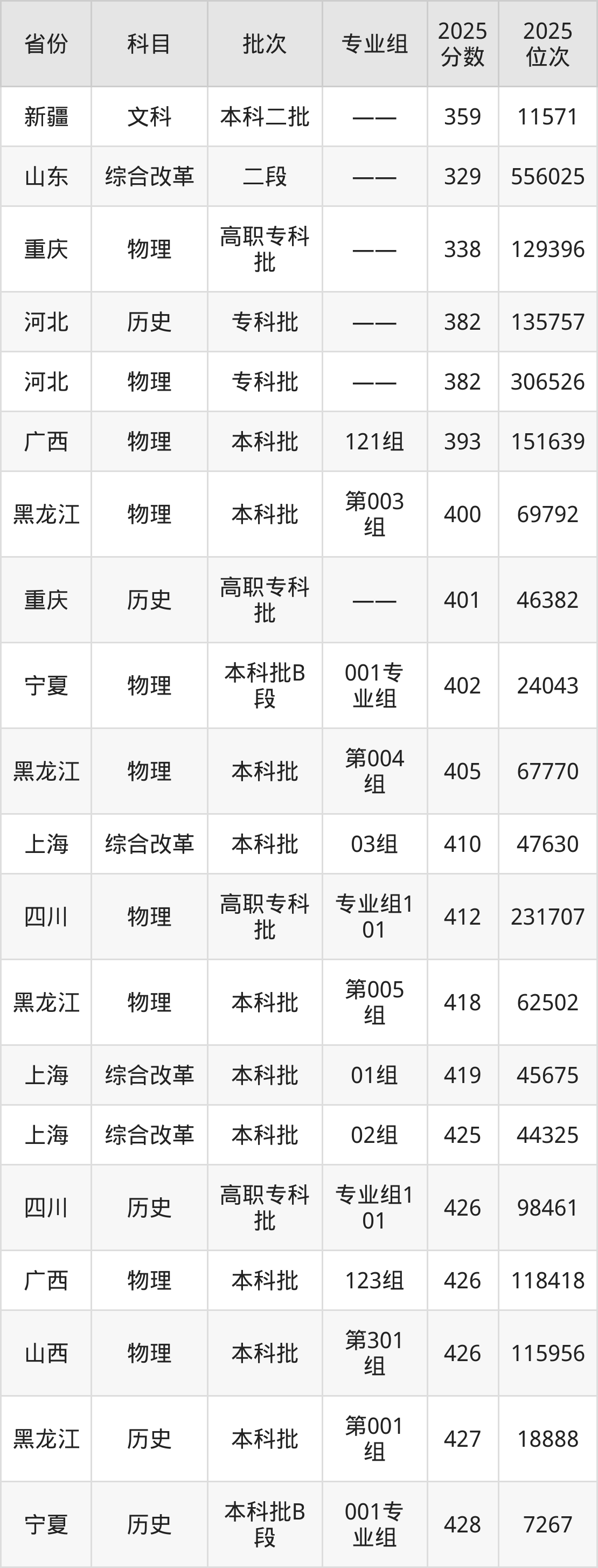最低录取分数线是359分,对应位次是11571名,招生地区为新疆;
