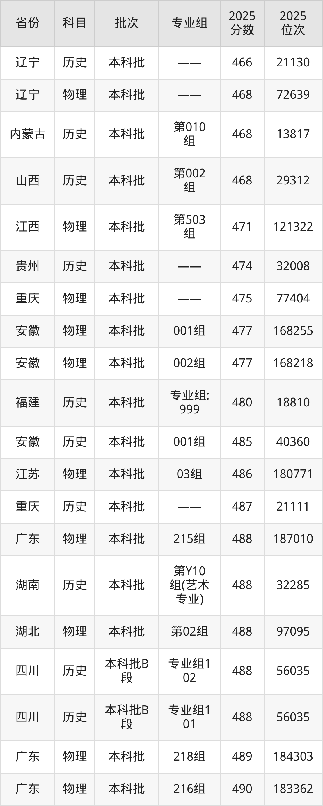 2025年四川传媒学院在各省普通批录取分数线一览表: