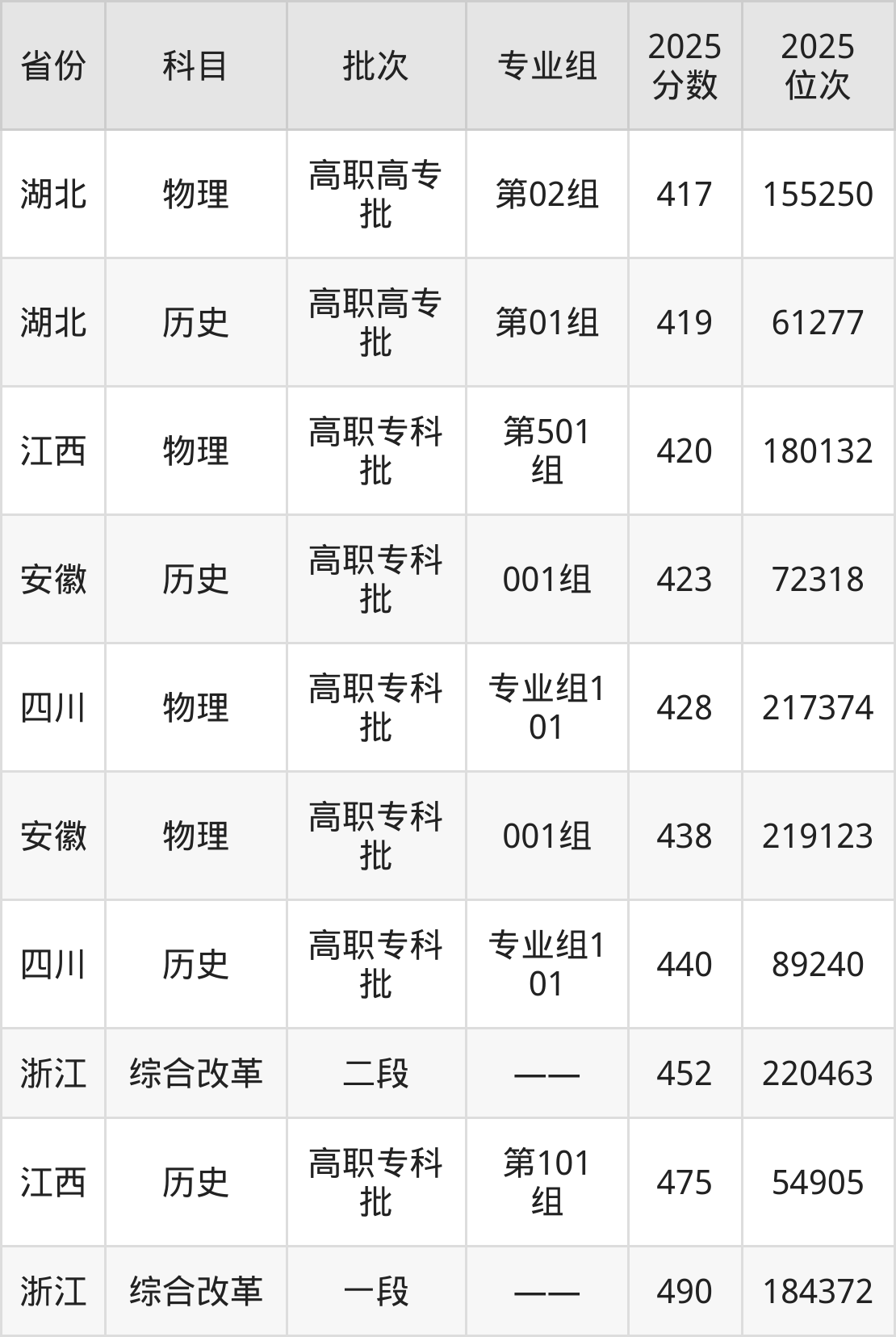 2025年义乌工商职业技术学院在各省普通批录取分数线一览表: