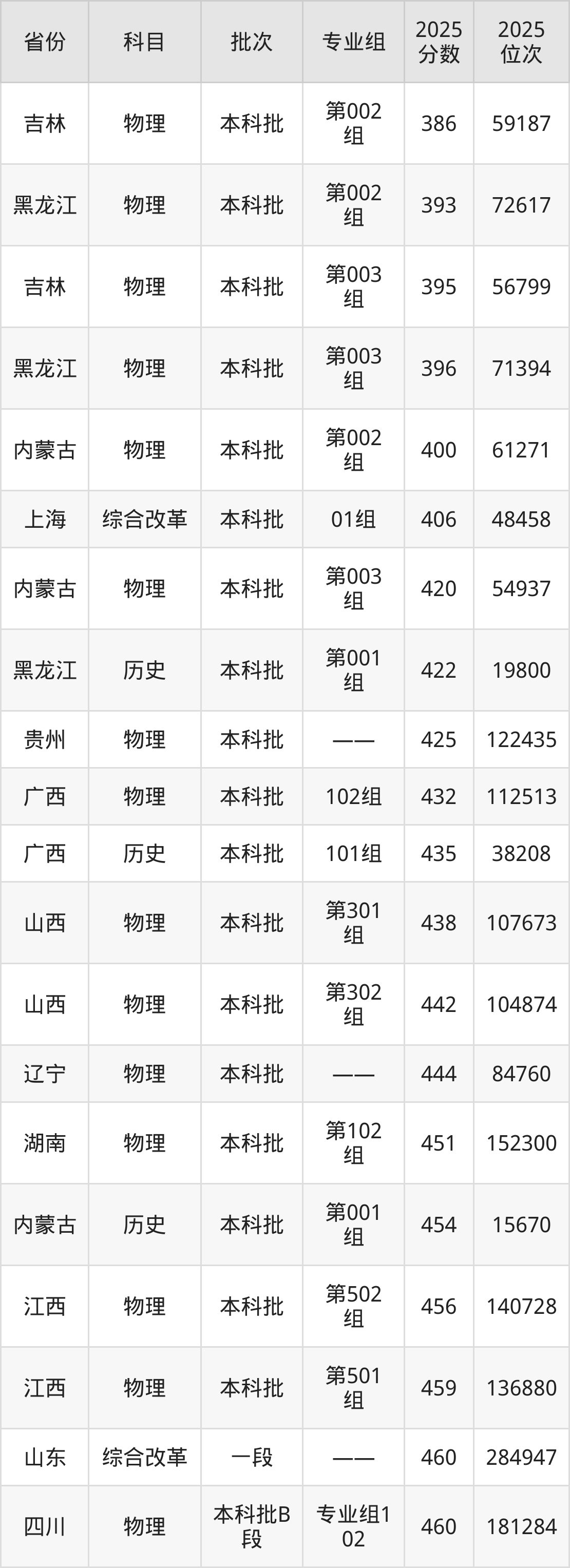 最低录取分数线是386分,对应位次是59187名,招生地区为吉林;