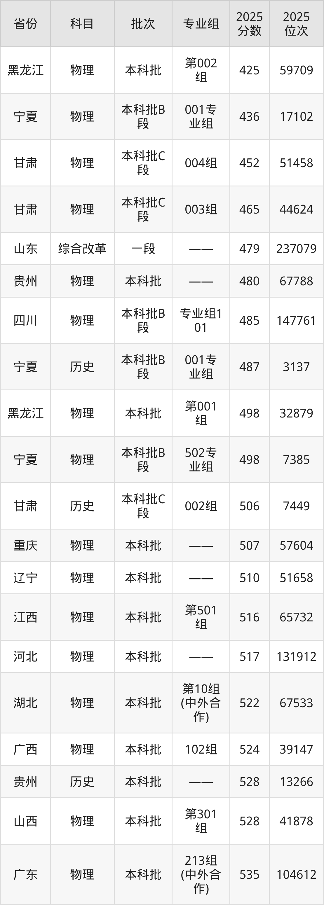 最低录取分数线是425分,对应位次是59709名,招生地区为黑龙江;