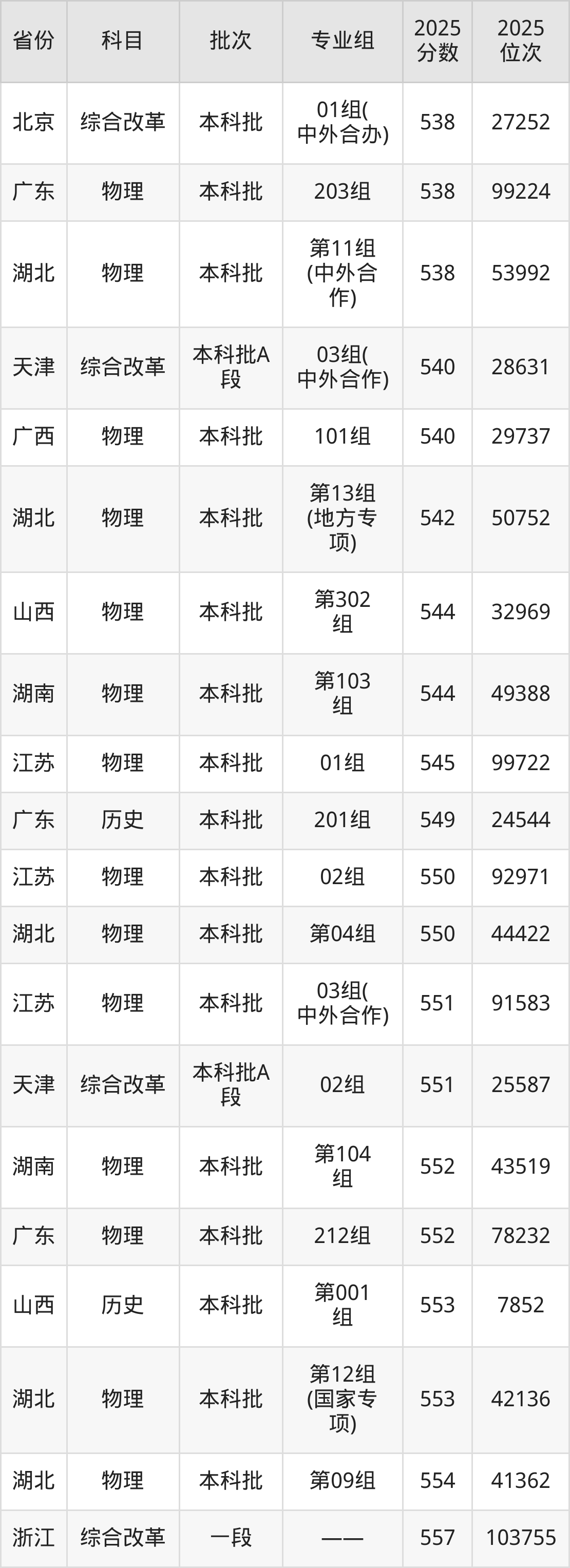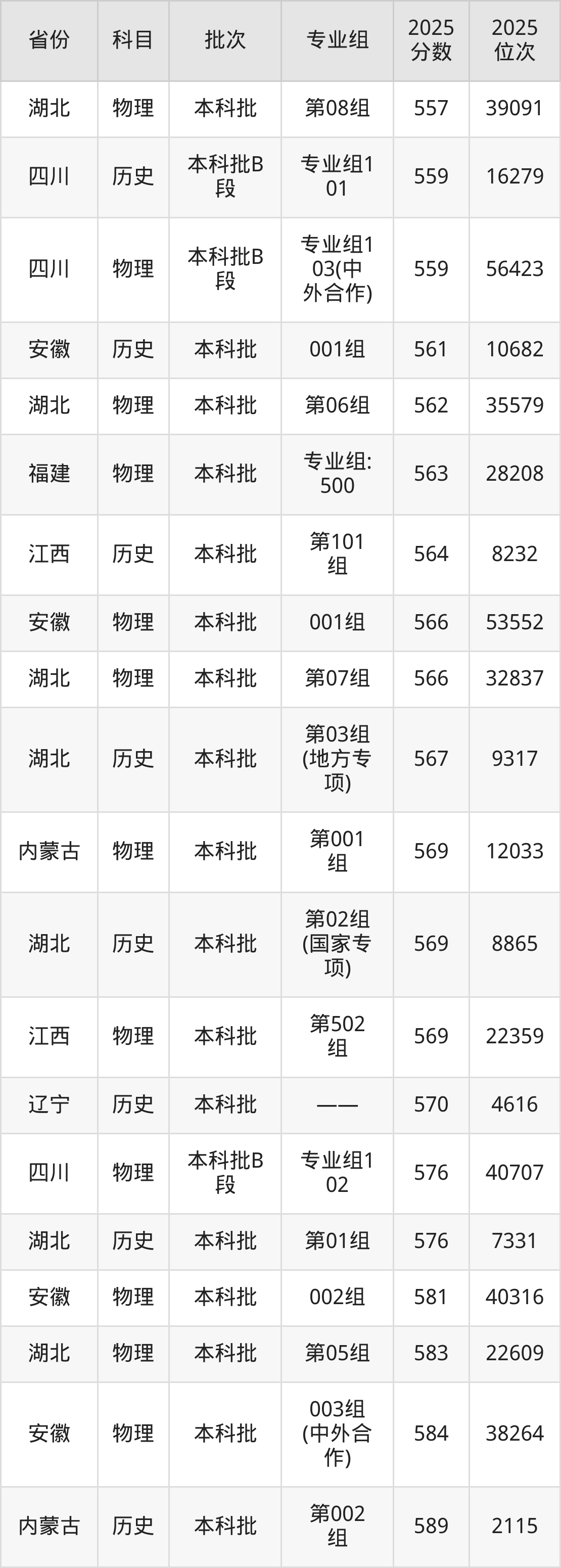 2025年湖北工业大学在各省普通批录取分数线一览表: