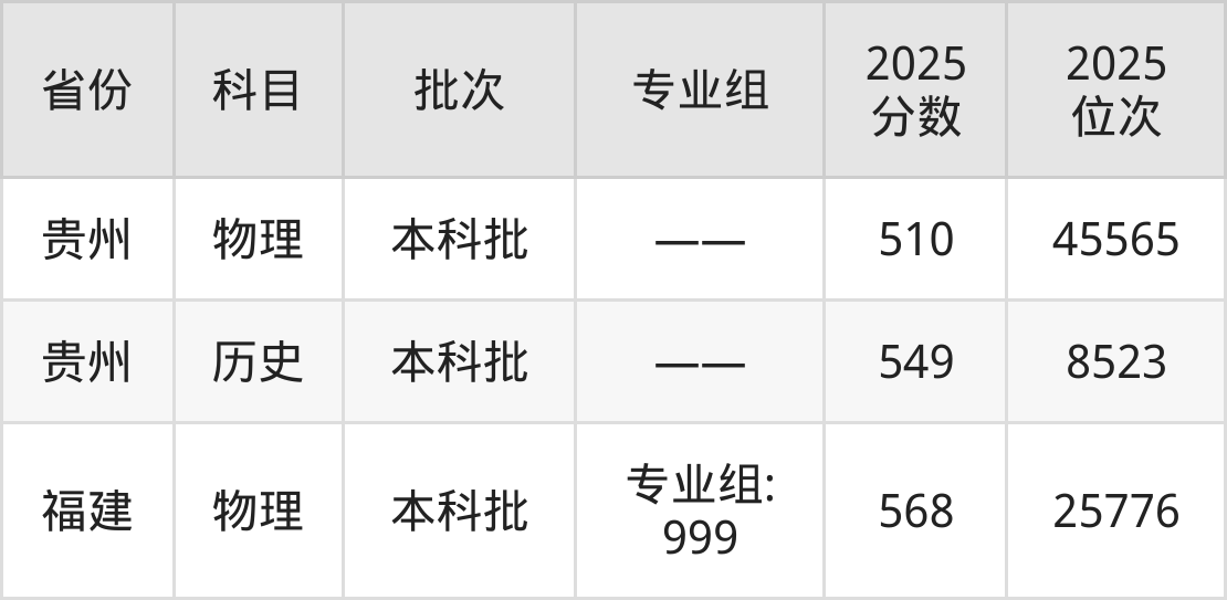最低录取分数线是549分,对应位次是8523名,招生地区为贵州。