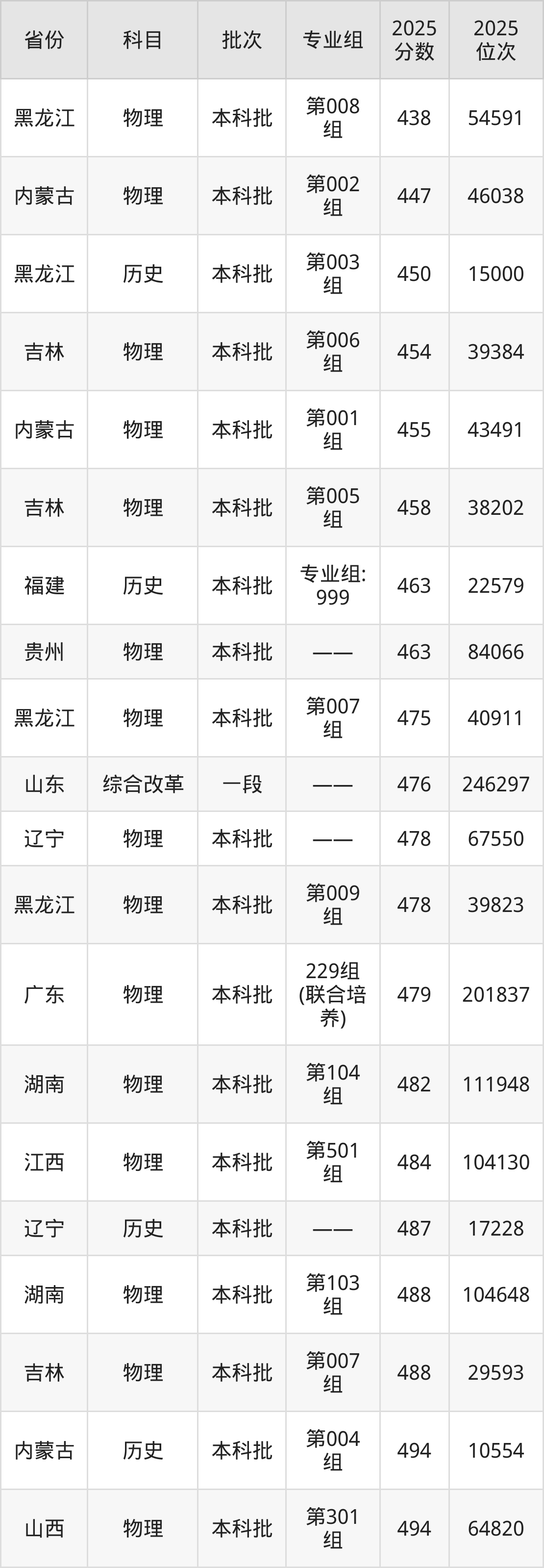 最低录取分数线是450分,对应位次是15000名,招生地区为黑龙江;