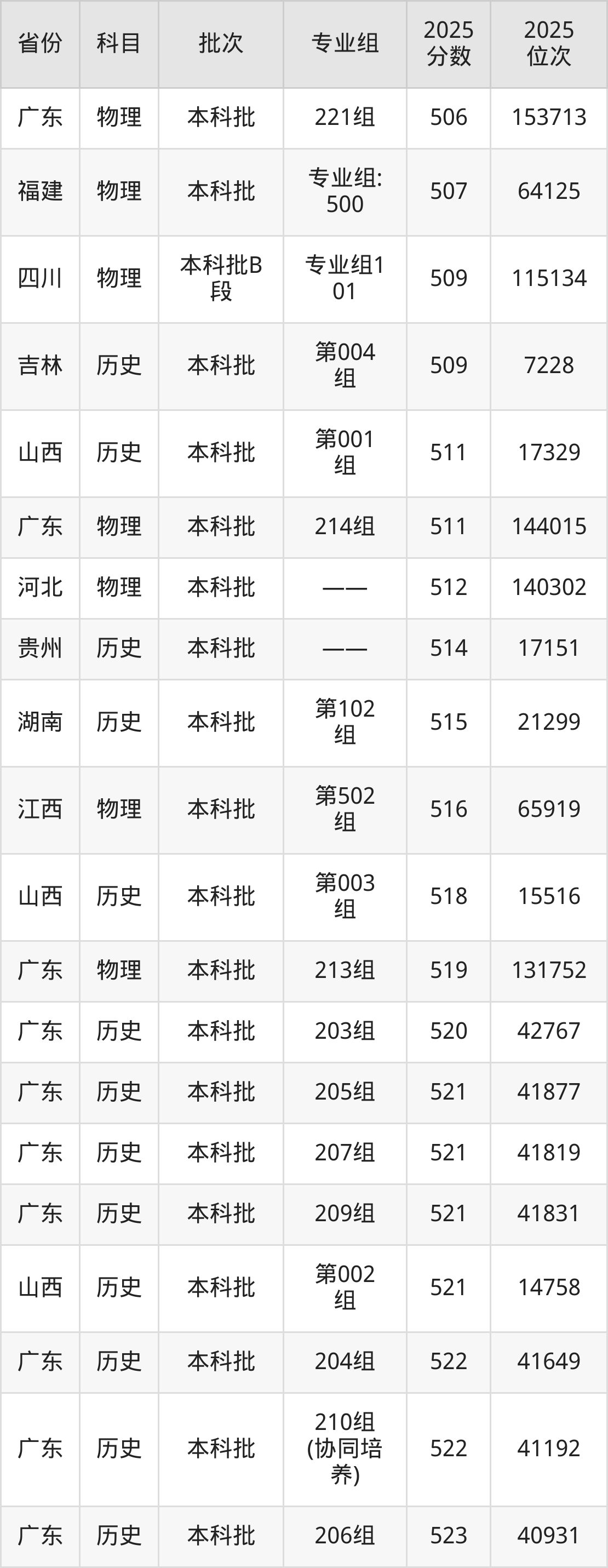 最高录取分数线是519分,对应位次是131752名,招生地区为广东。