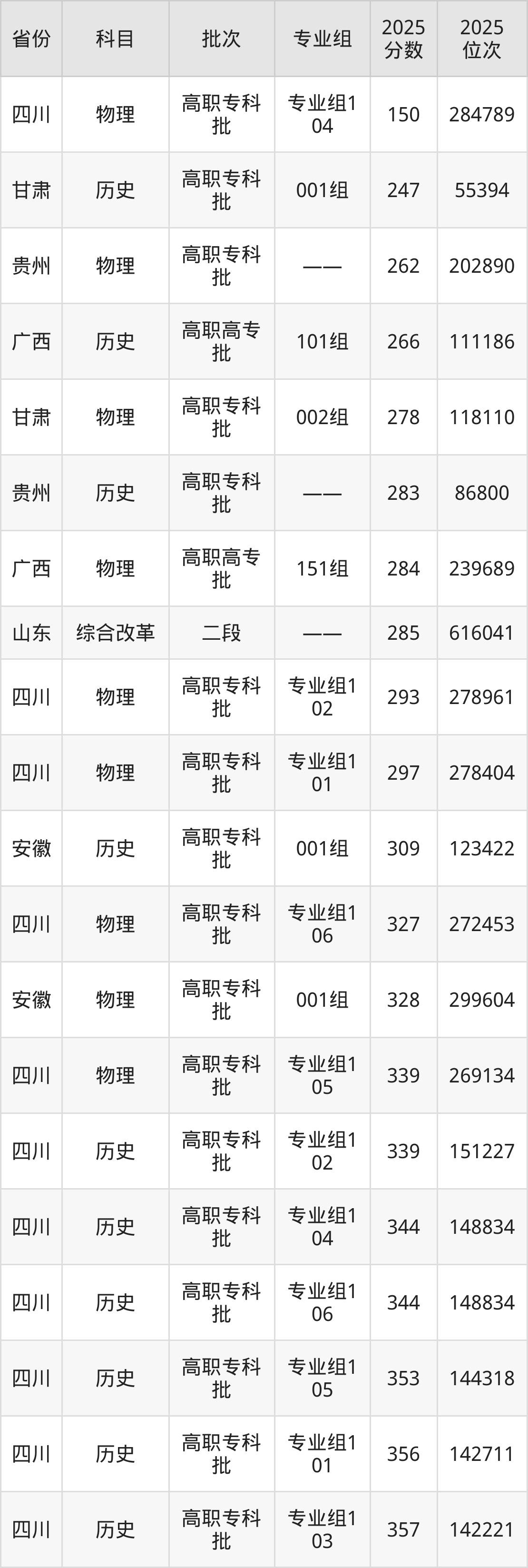 最低录取分数线是150分,对应位次是284789名,招生地区为四川;