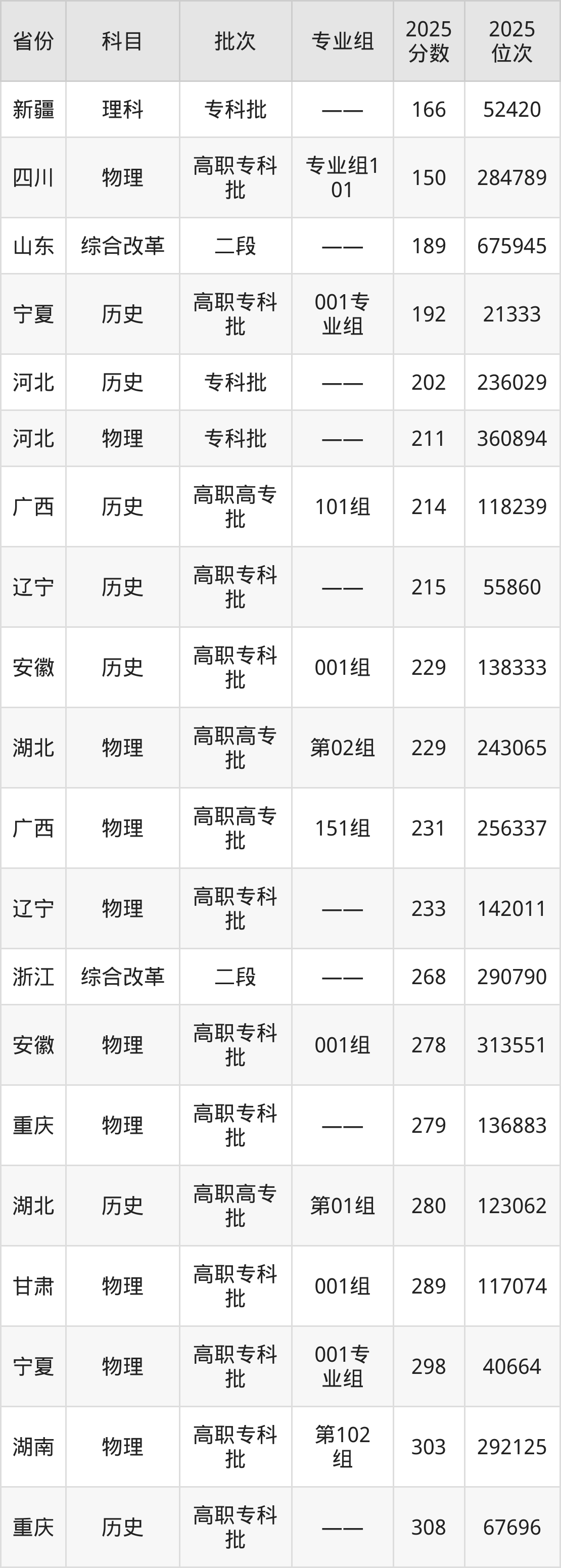 2025年重庆电信职业学院在各省物理类和理科的录取分数线位于150分-303分之间。