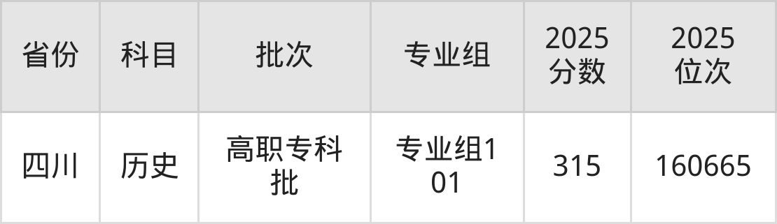 最高录取分数线是315分,对应位次是160665名,招生地区为四川。