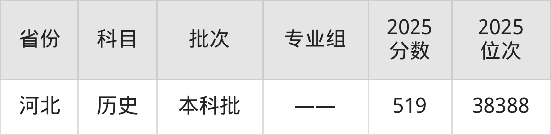 最低录取分数线是519分,对应位次是38388名,招生地区为河北。