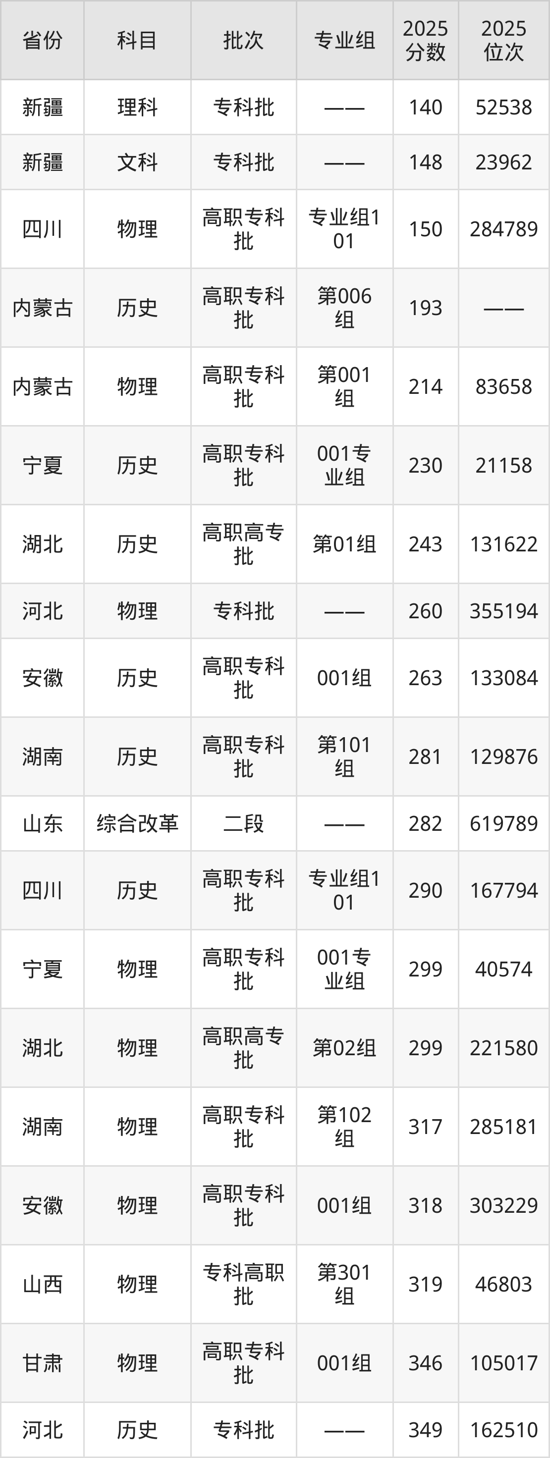 2025年阿拉善职业技术学院在各省物理类和理科的录取分数线位于140分-346分之间。