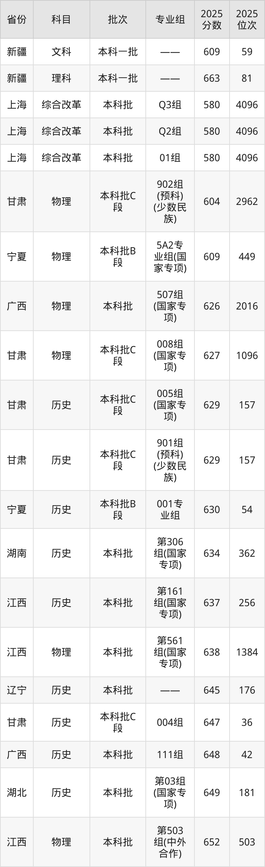 最低录取分数线是609分,对应位次是59名,招生地区为新疆;