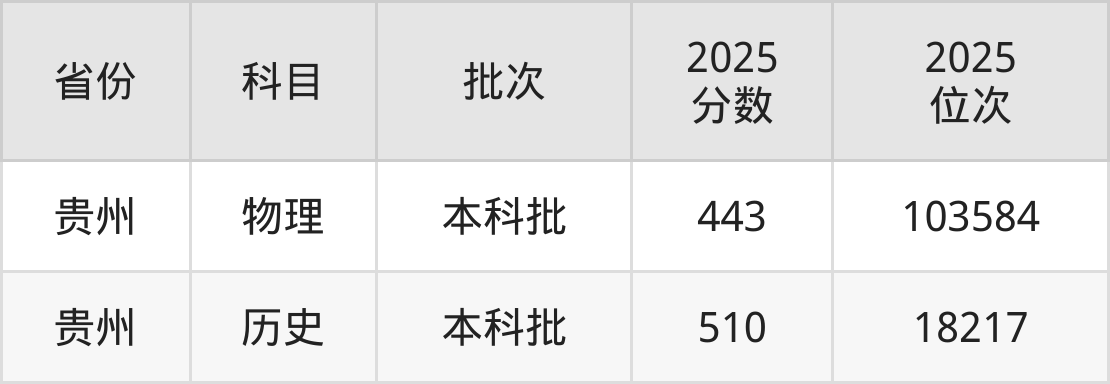 最低录取分数线是443分,对应位次是103584名,招生地区为贵州。