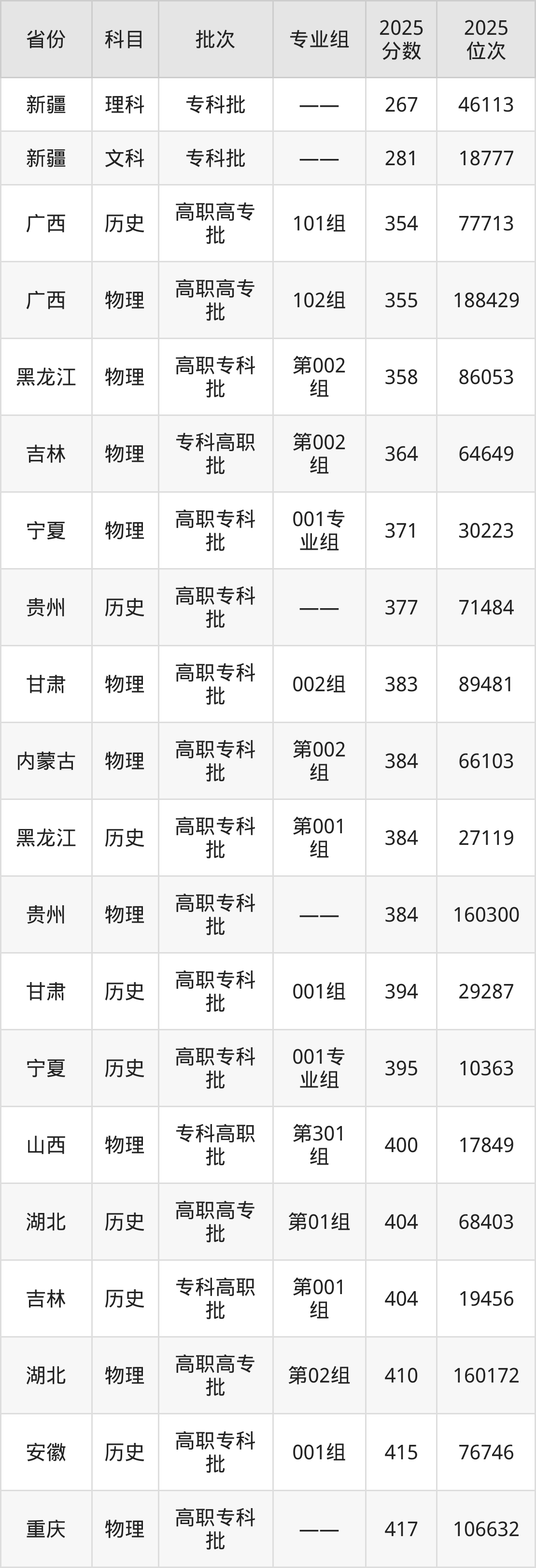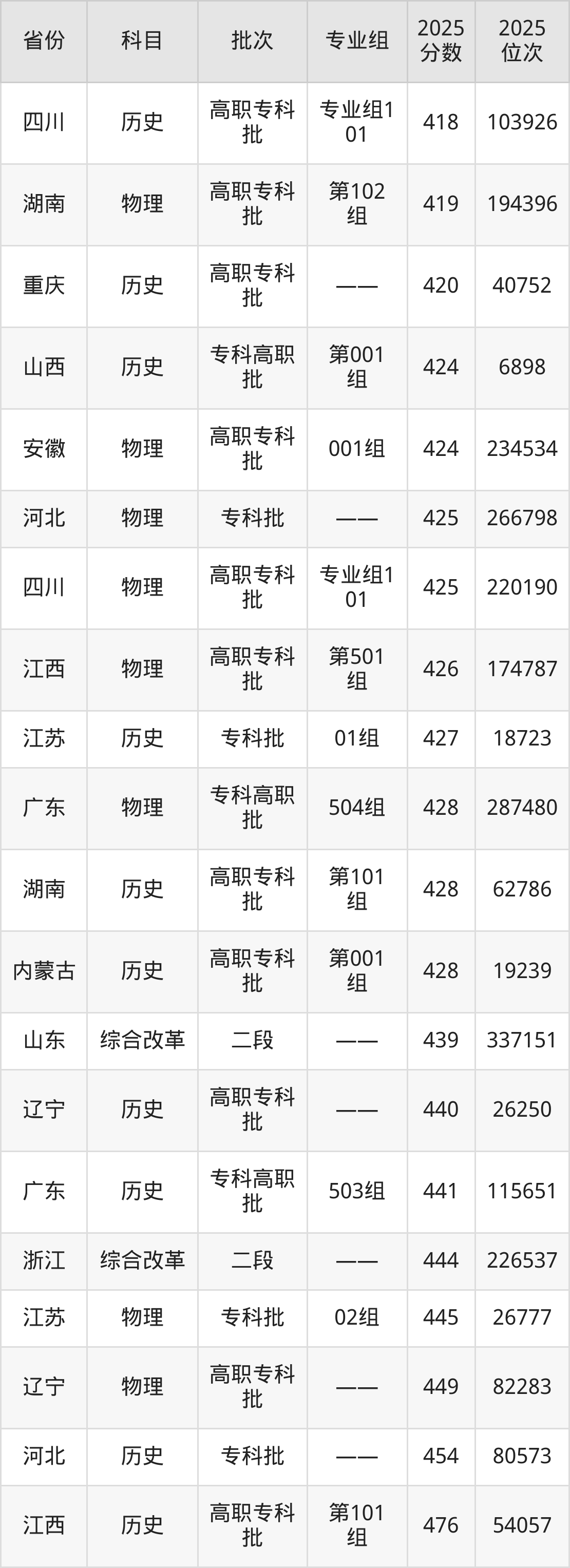 2025年三峡电力职业学院在各省普通批录取分数线一览表: