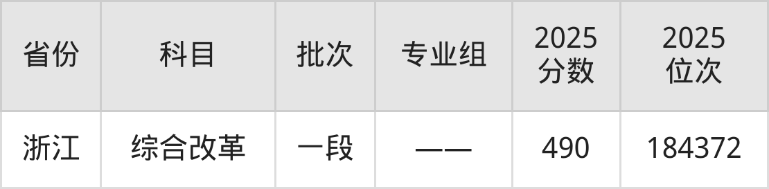 最高录取分数线是490分,对应位次是184372名,招生地区为浙江。