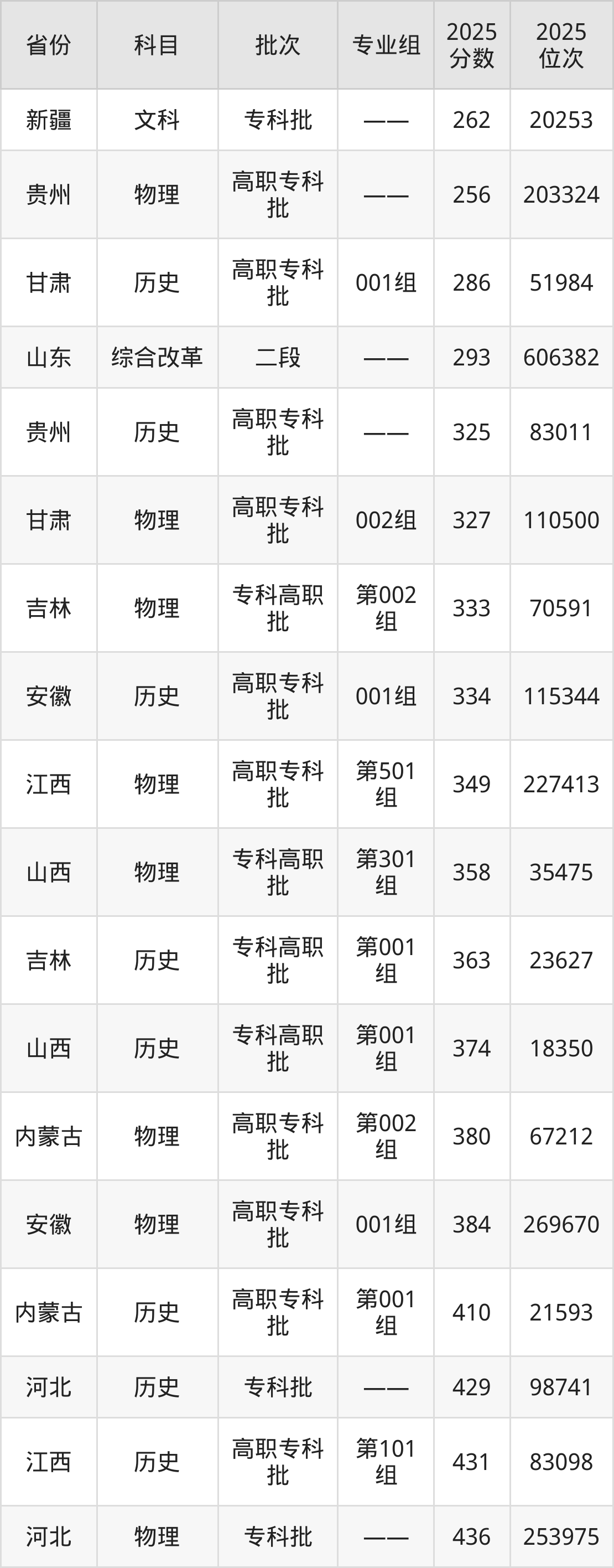 2025年济宁职业技术学院在各省普通批录取分数线一览表: