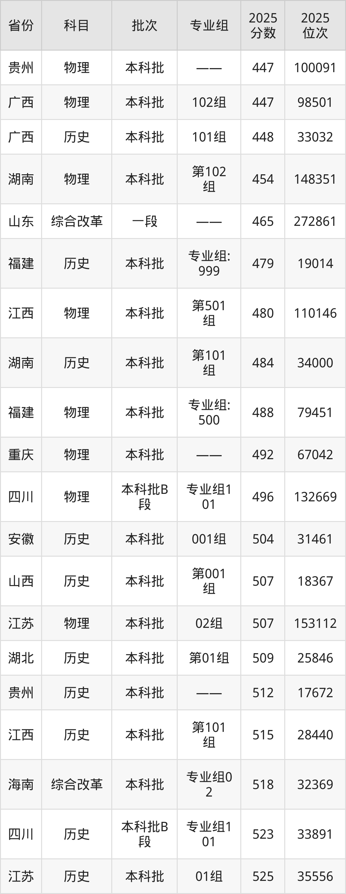 最低录取分数线是447分,对应位次是100091名,招生地区为贵州;