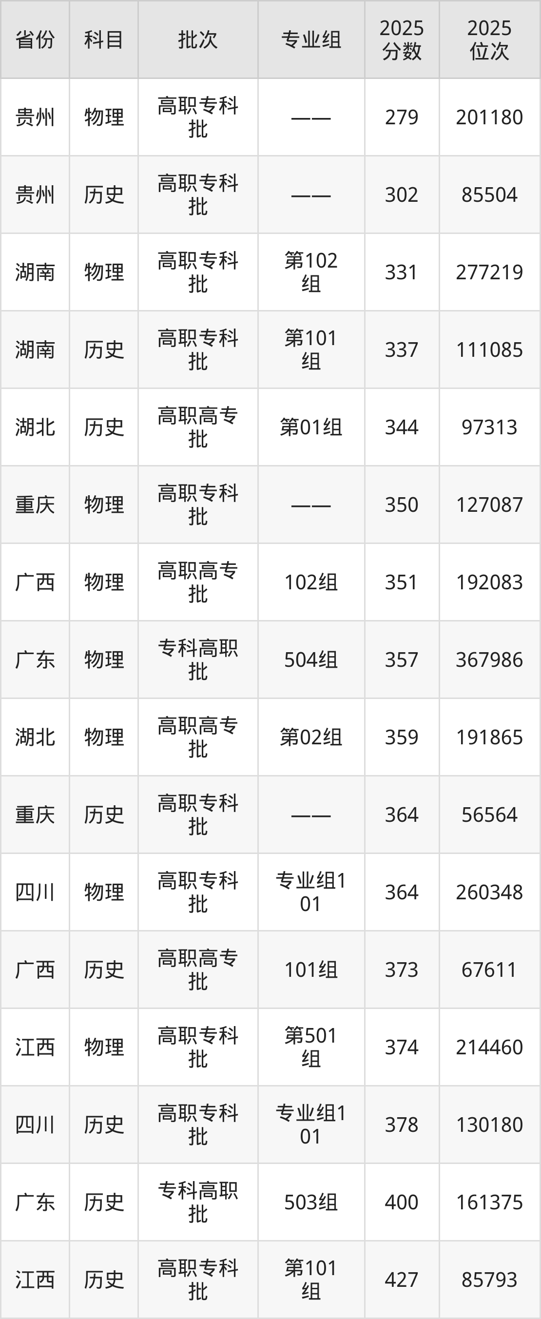 2025年湘西民族职业技术学院在各省普通批录取分数线一览表: