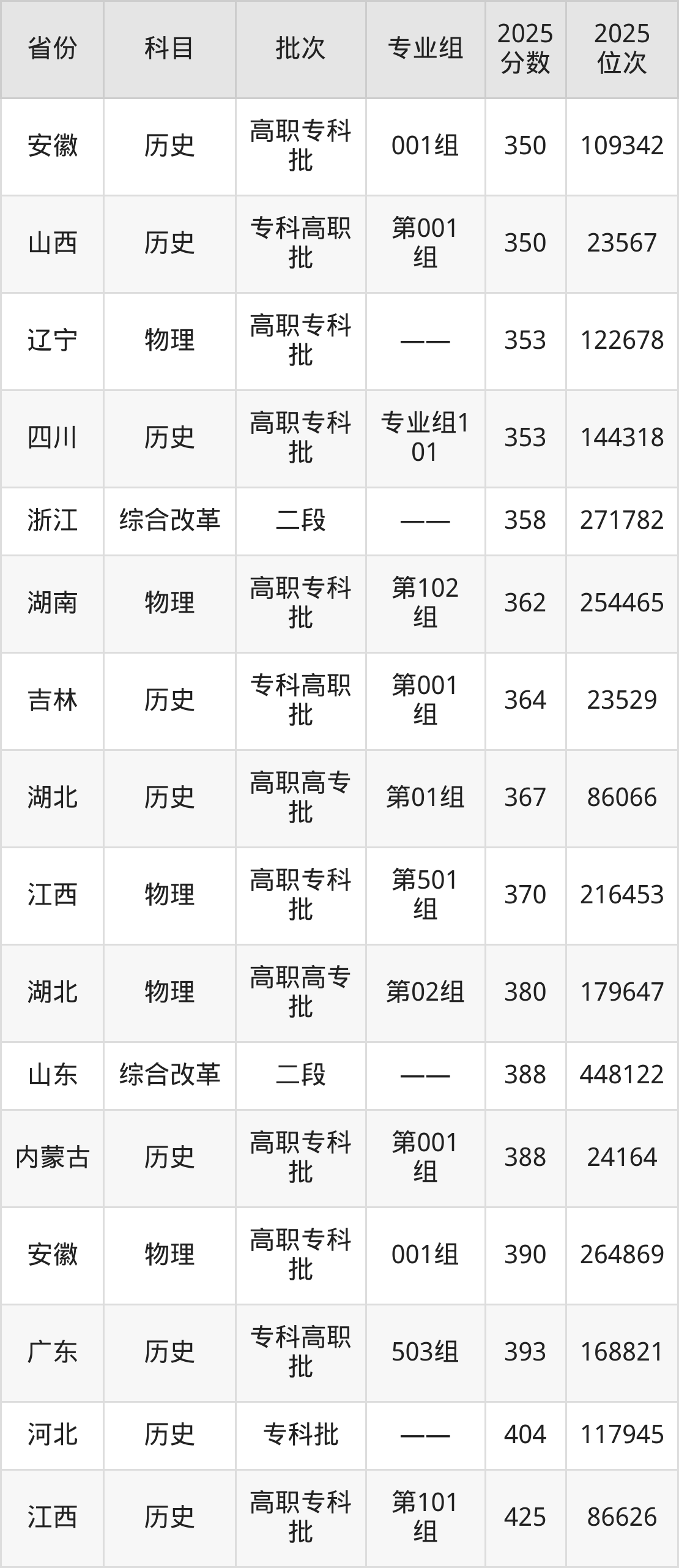 2025年黑龙江职业学院在各省普通批录取分数线一览表: