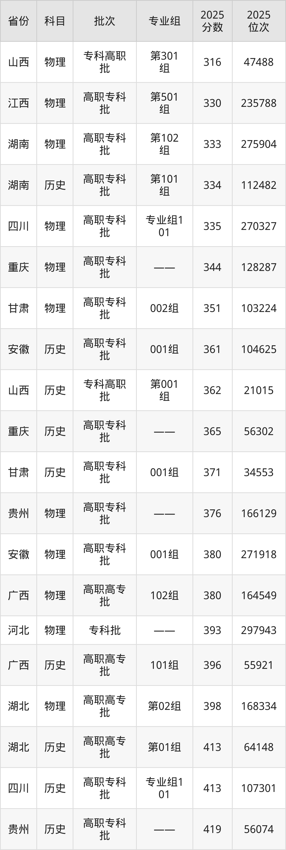 2025年重庆城市职业学院在各省普通批录取分数线一览表: