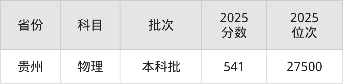 最低录取分数线是541分,对应位次是27500名,招生地区为贵州。