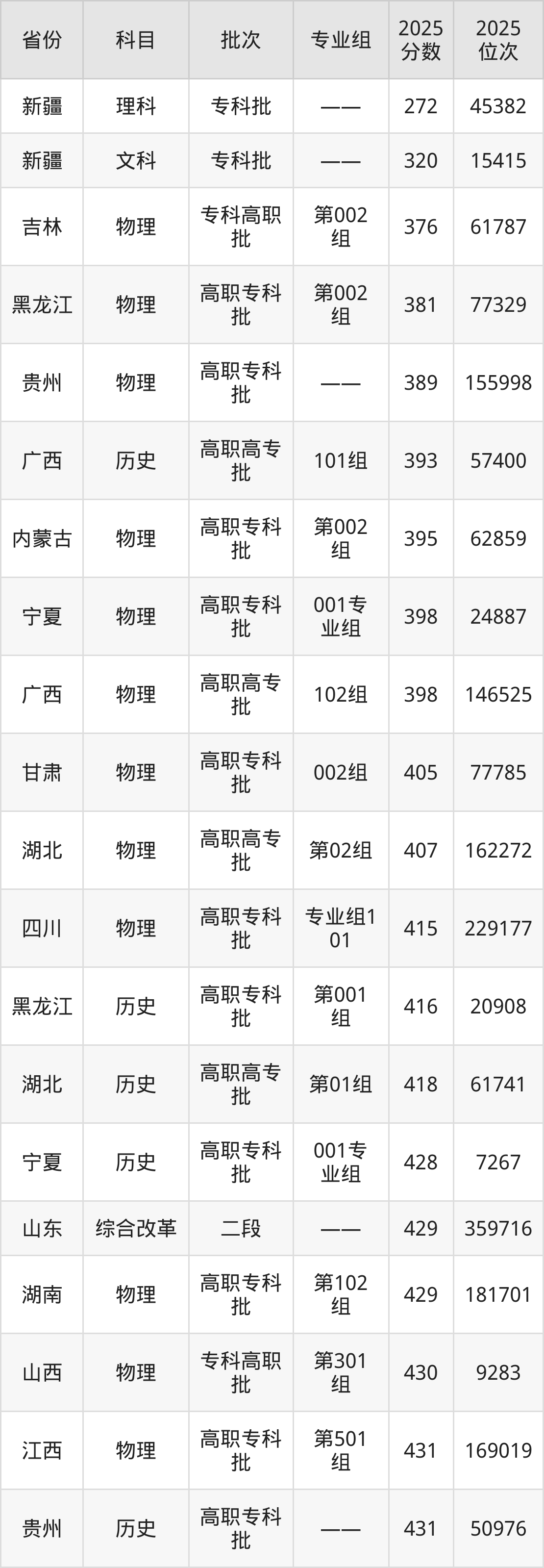 最低录取分数线是320分,对应位次是15415名,招生地区为新疆;