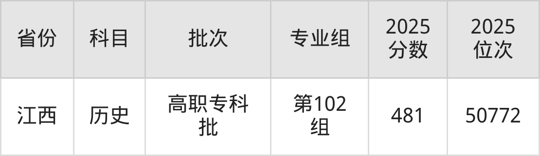 最高录取分数线是481分,对应位次是50772名,招生地区为江西。