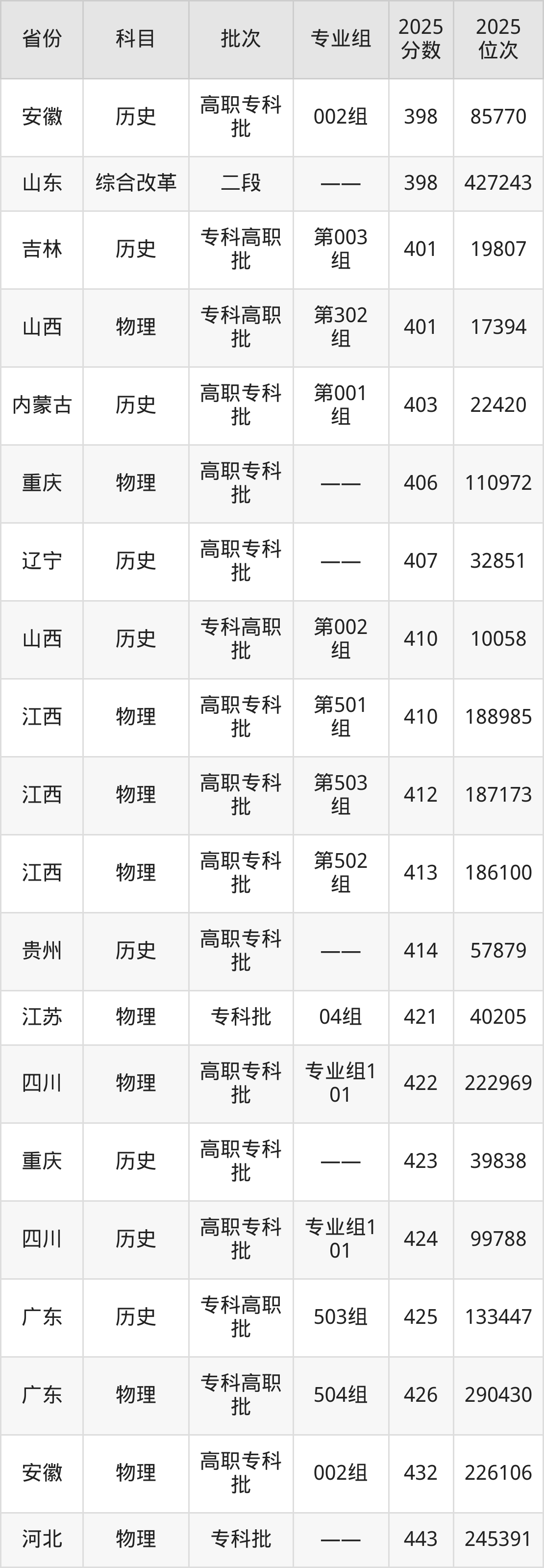最低录取分数线是398分,对应位次是427243名,招生地区为山东。